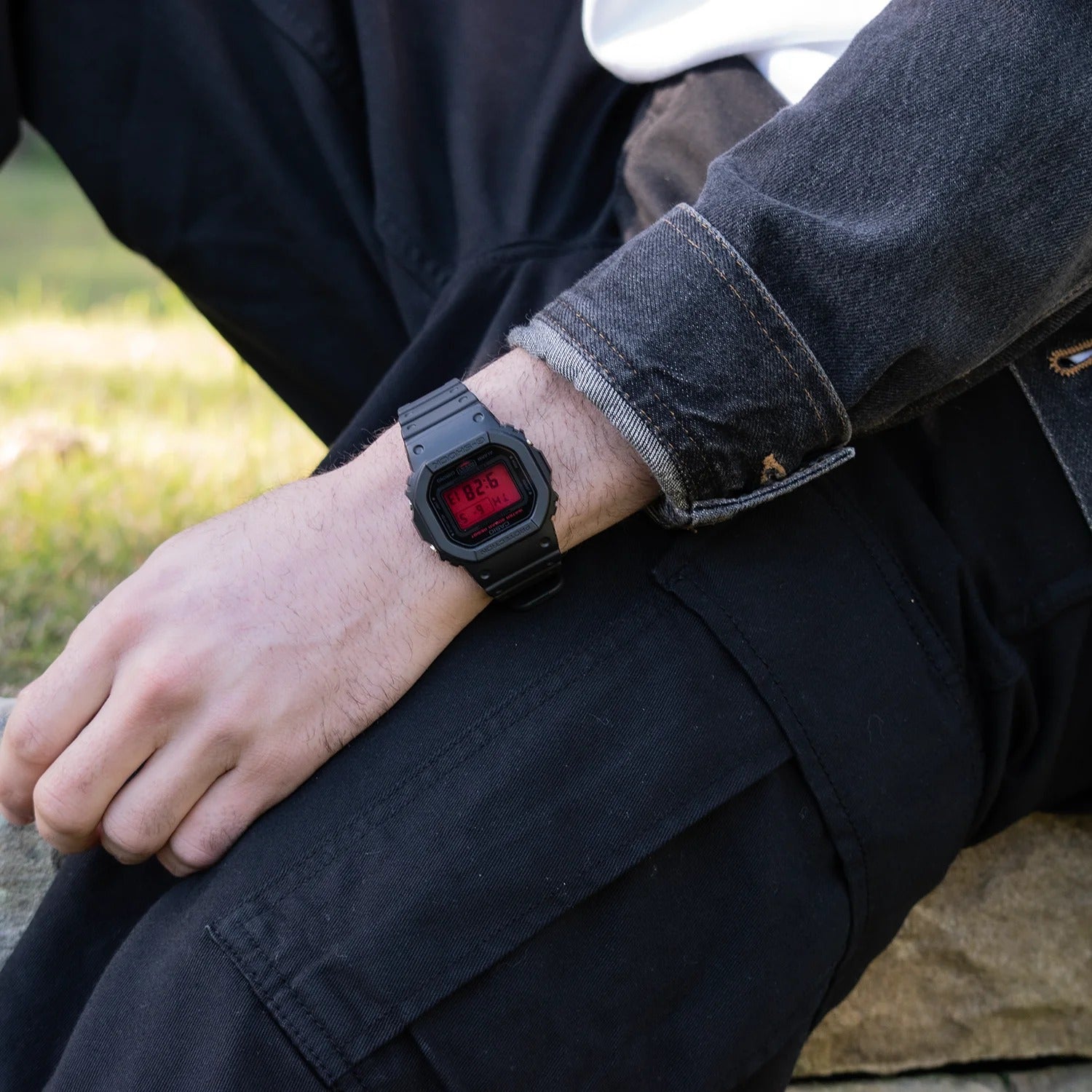 Casio DW-5600BBR-1D, G-SHOCK black red watch, red reverse display G-SHOCK, square G-SHOCK digital, 200M water resistant Casio, shock resistant digital watch, LED backlight stopwatch timer, men’s sports digital watch, DW-5600 series stealth, blackout G-SHOCK with red LCD