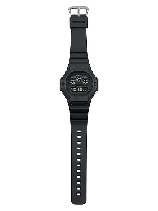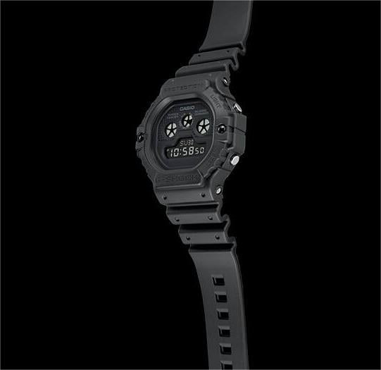 A black CASIO G-SHOCK DW-5900BB-1DR digital watch with a resin band and a digital display showing time, date, and various watch features.