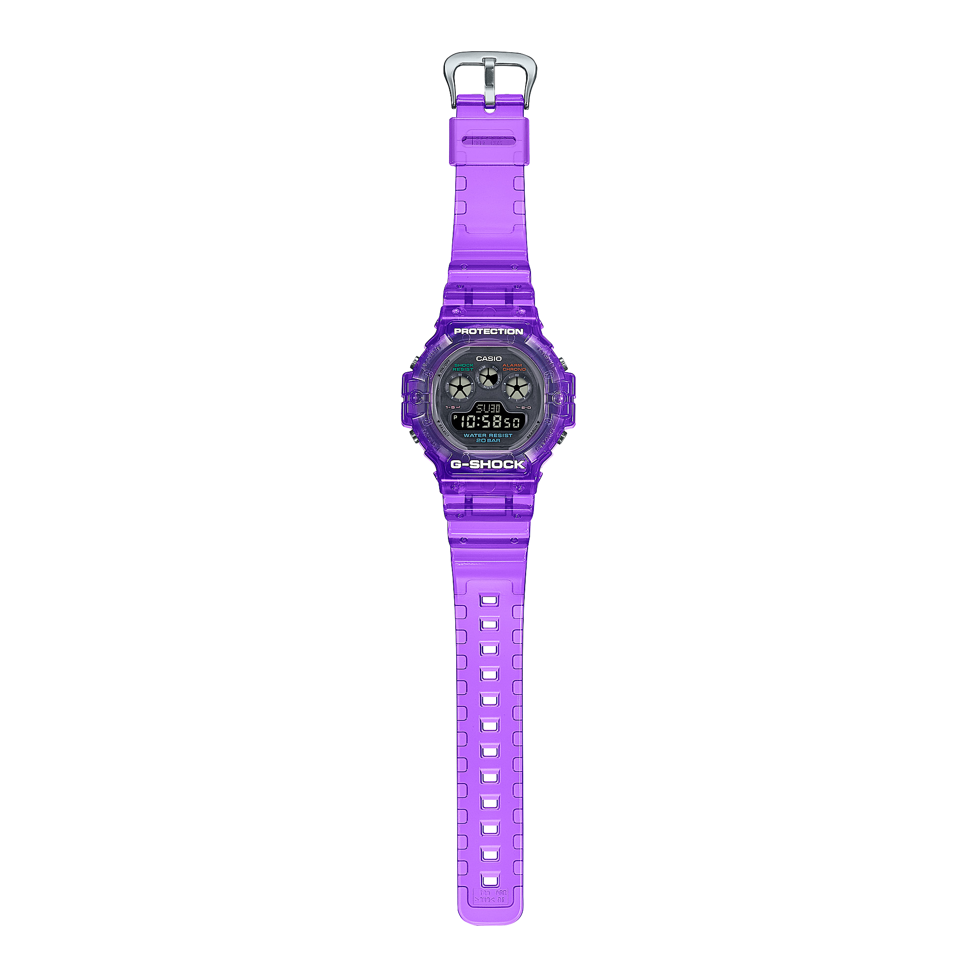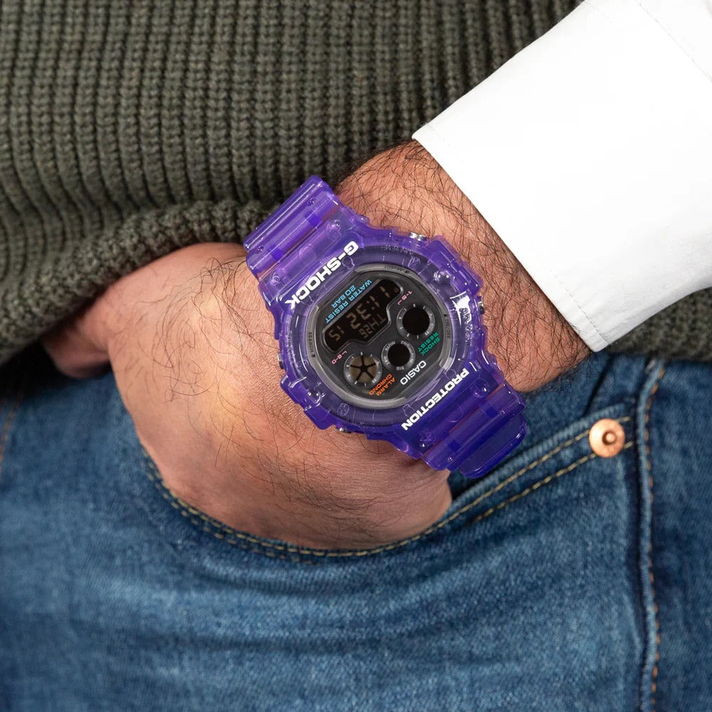 A purple CASIO G-SHOCK digital watch with resin band and bezel, displaying time and various watch features, mounted on a white background.
