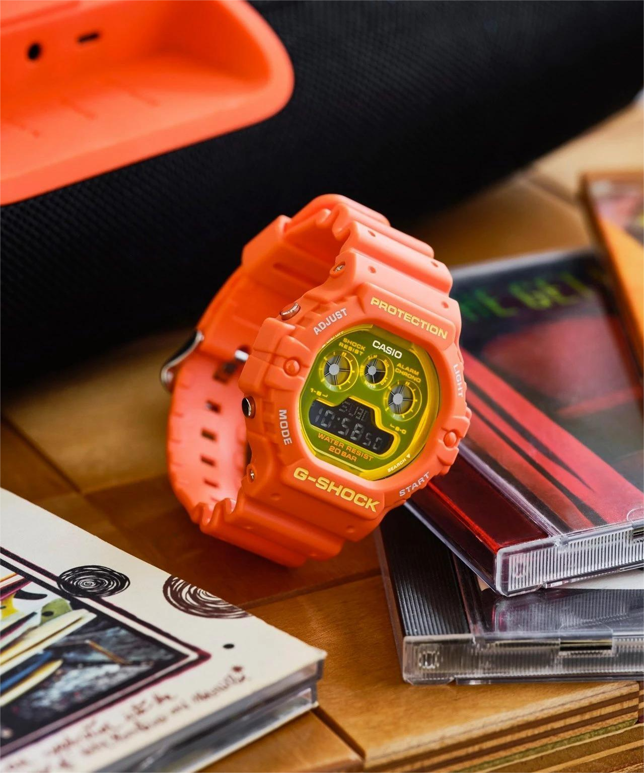 A Casio G-Shock digital watch in orange color with a resin band and a digital display, featuring multiple watch features such as world time, stopwatch, and alarm functions.