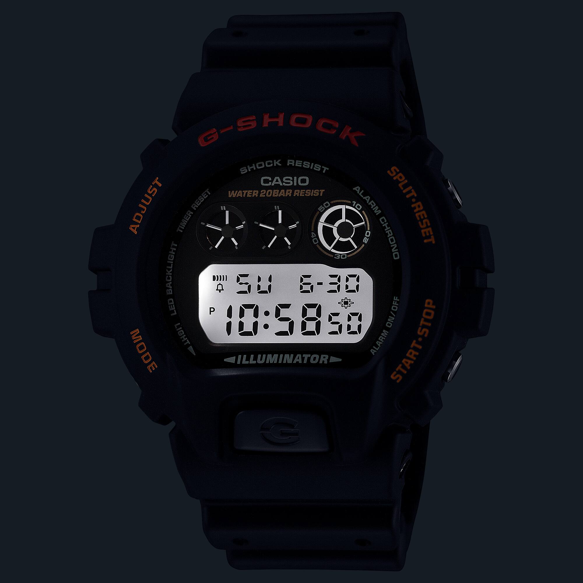 A black CASIO G-SHOCK DW-6900 digital watch with a black band, digital display, and red accents.