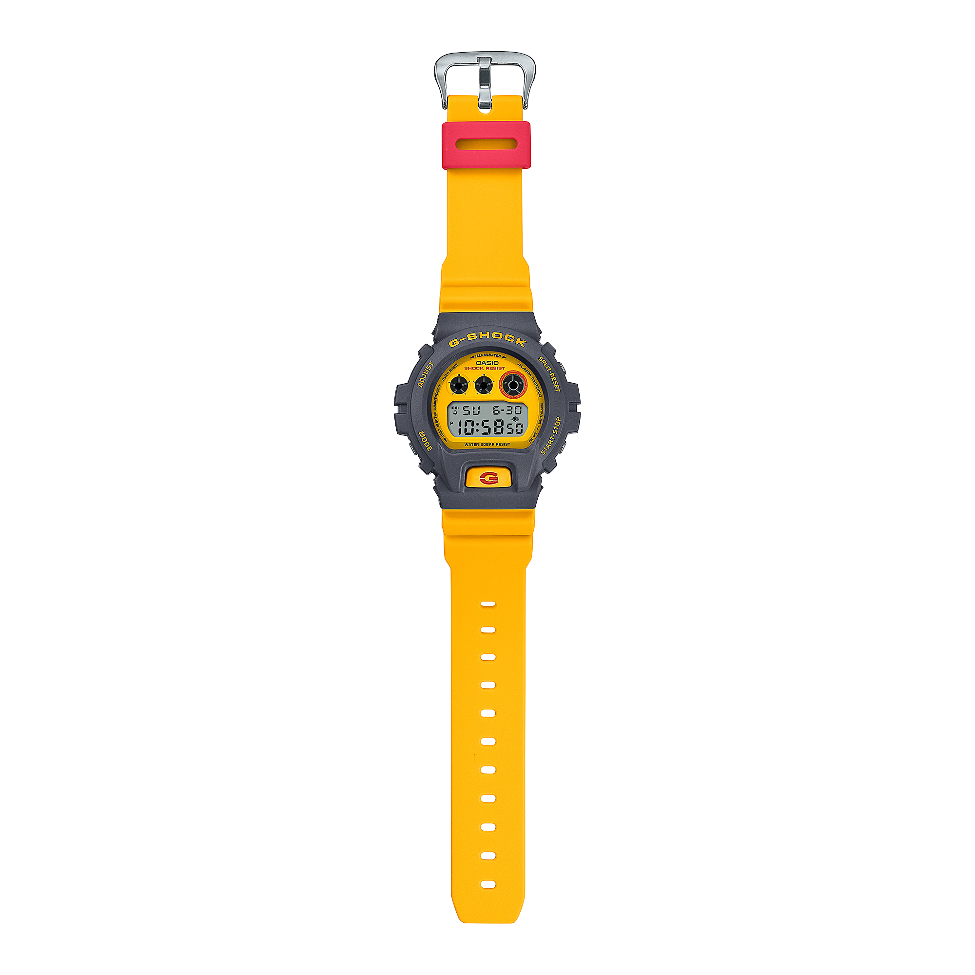 A Casio G-Shock DW-6900Y-9DR watch with a yellow band and grey case, displaying a digital watch face.