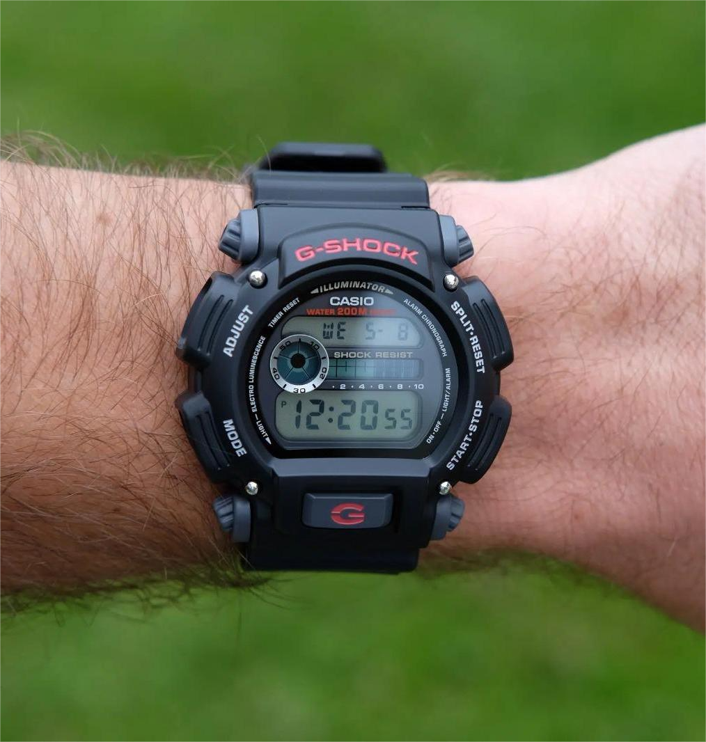 A black CASIO G-SHOCK DW-9052-1V digital watch with a resin band and a digital display showing time, date, and various watch features.
