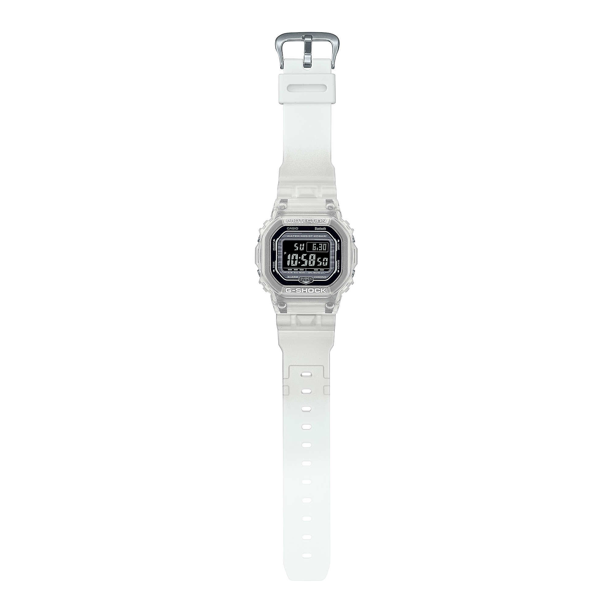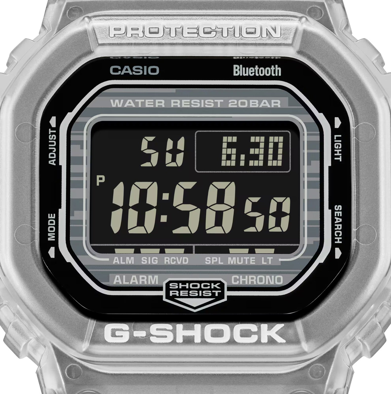 A digital CASIO G-SHOCK watch with a clear resin band and a black digital display showing time and various watch features.
