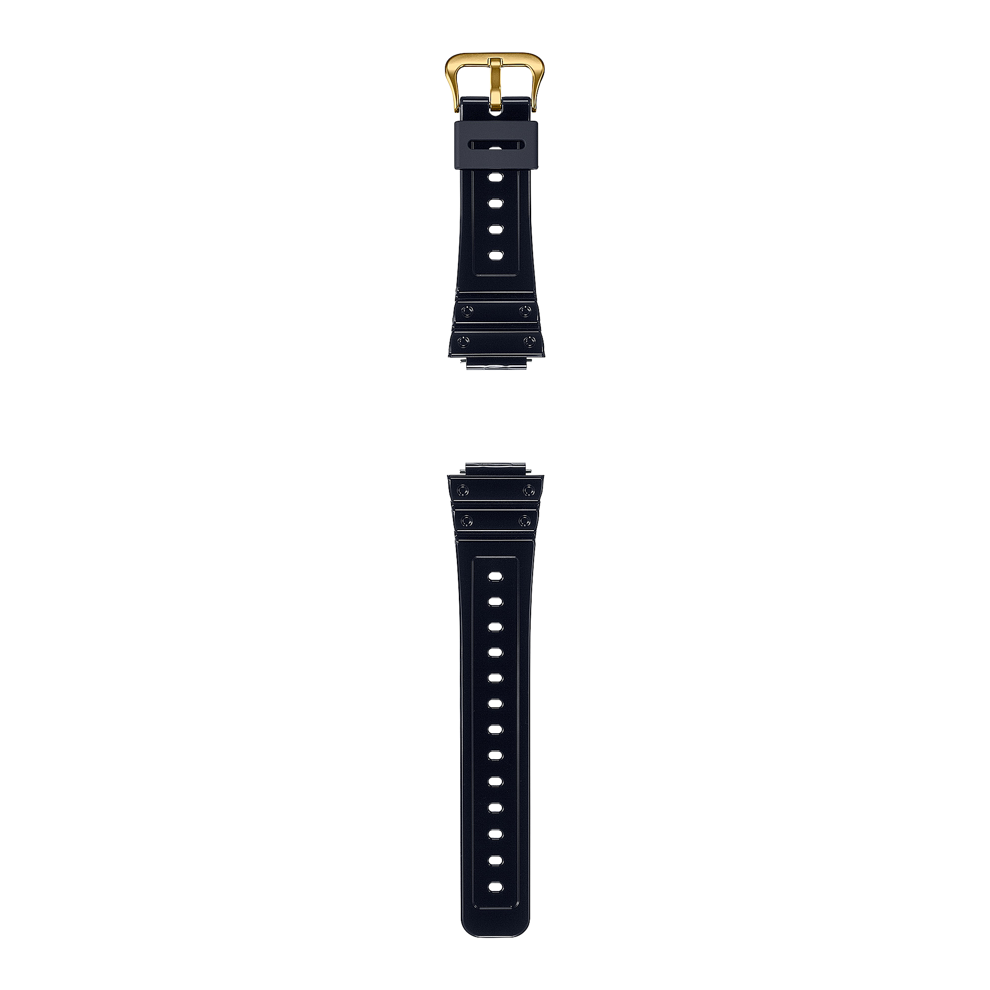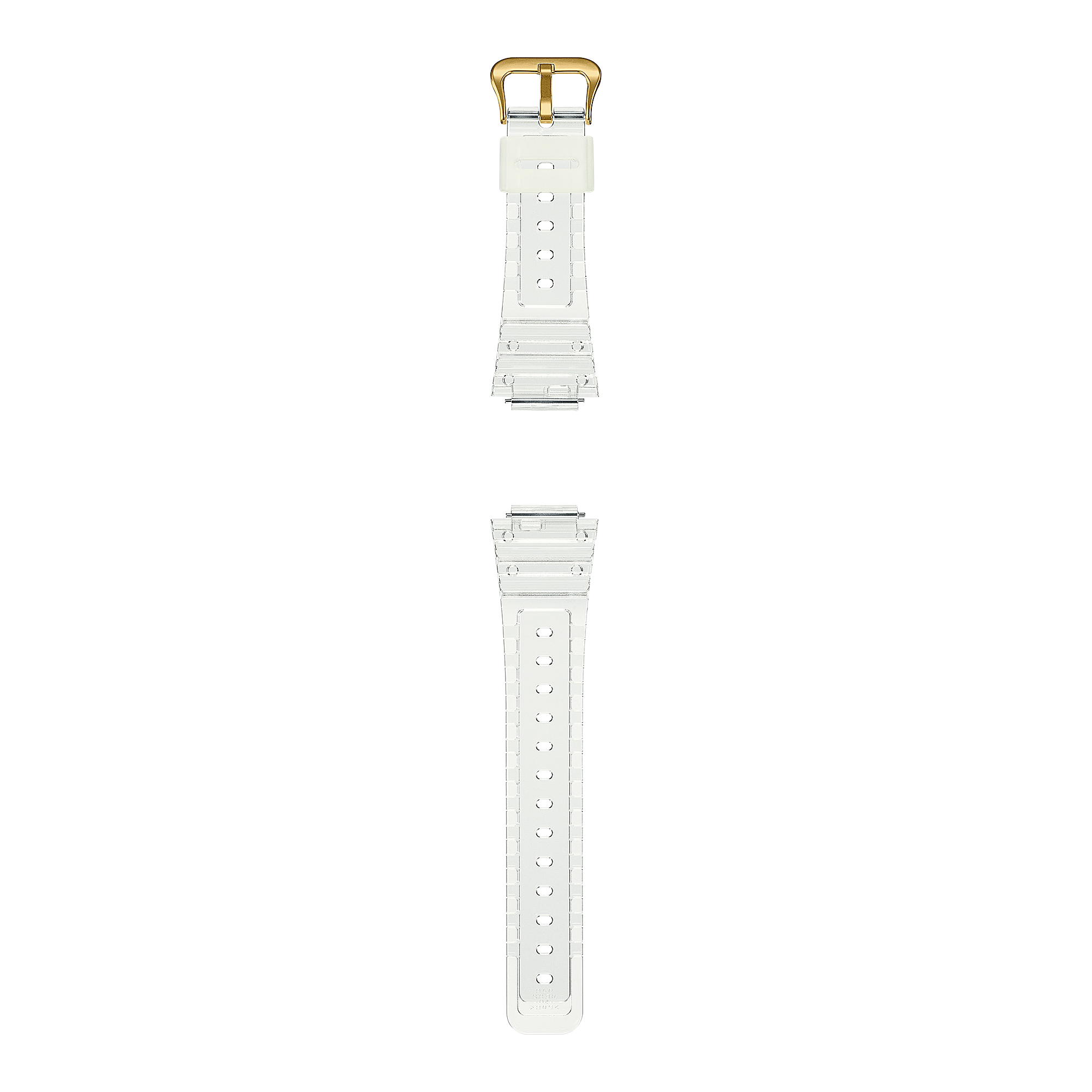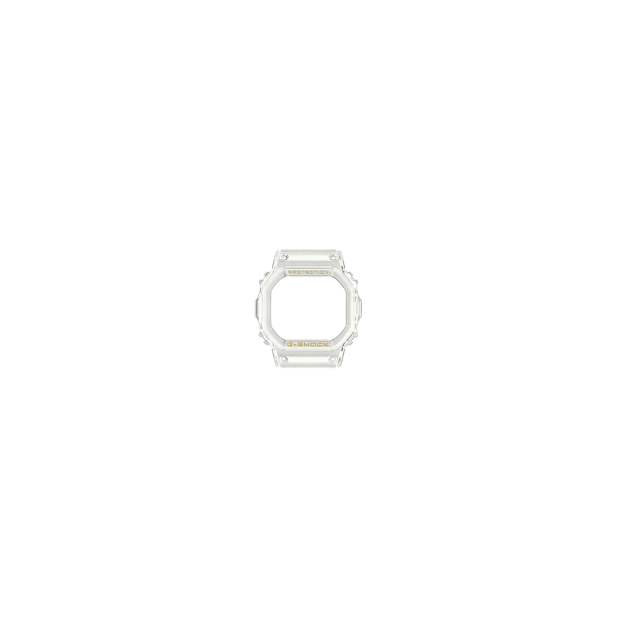 A digital Casio G-Shock watch with a gold resin band and case, displaying a patterned dial and typical G-Shock features.