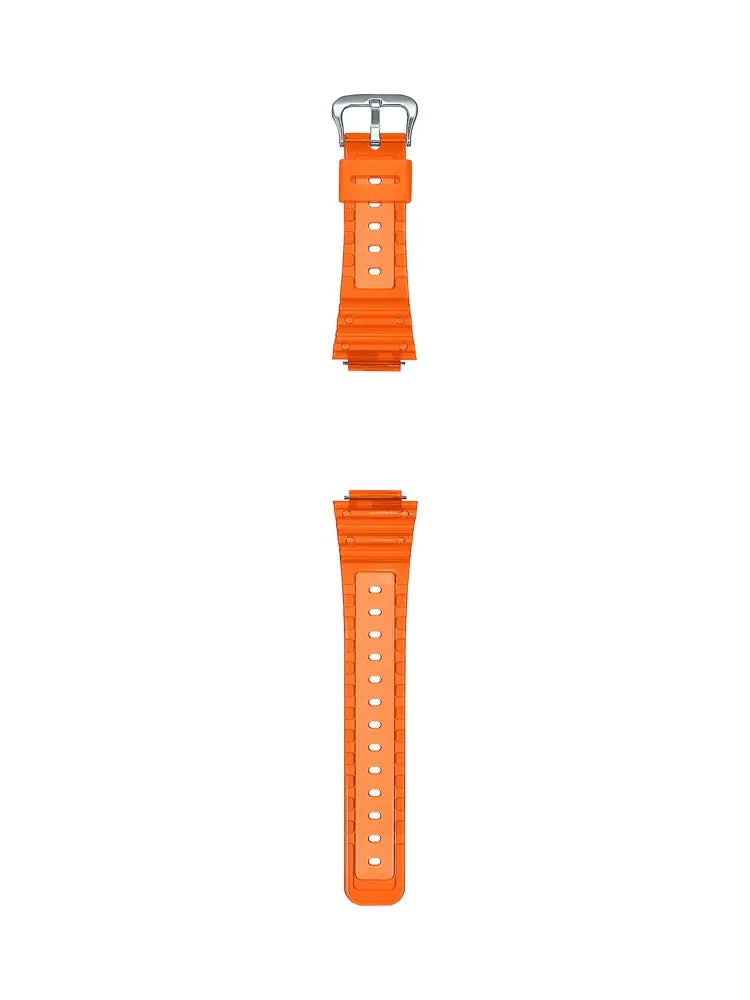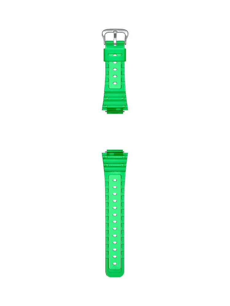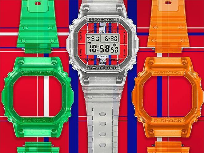 A digital CASIO G-SHOCK watch with a clear resin band and a red and white digital display.