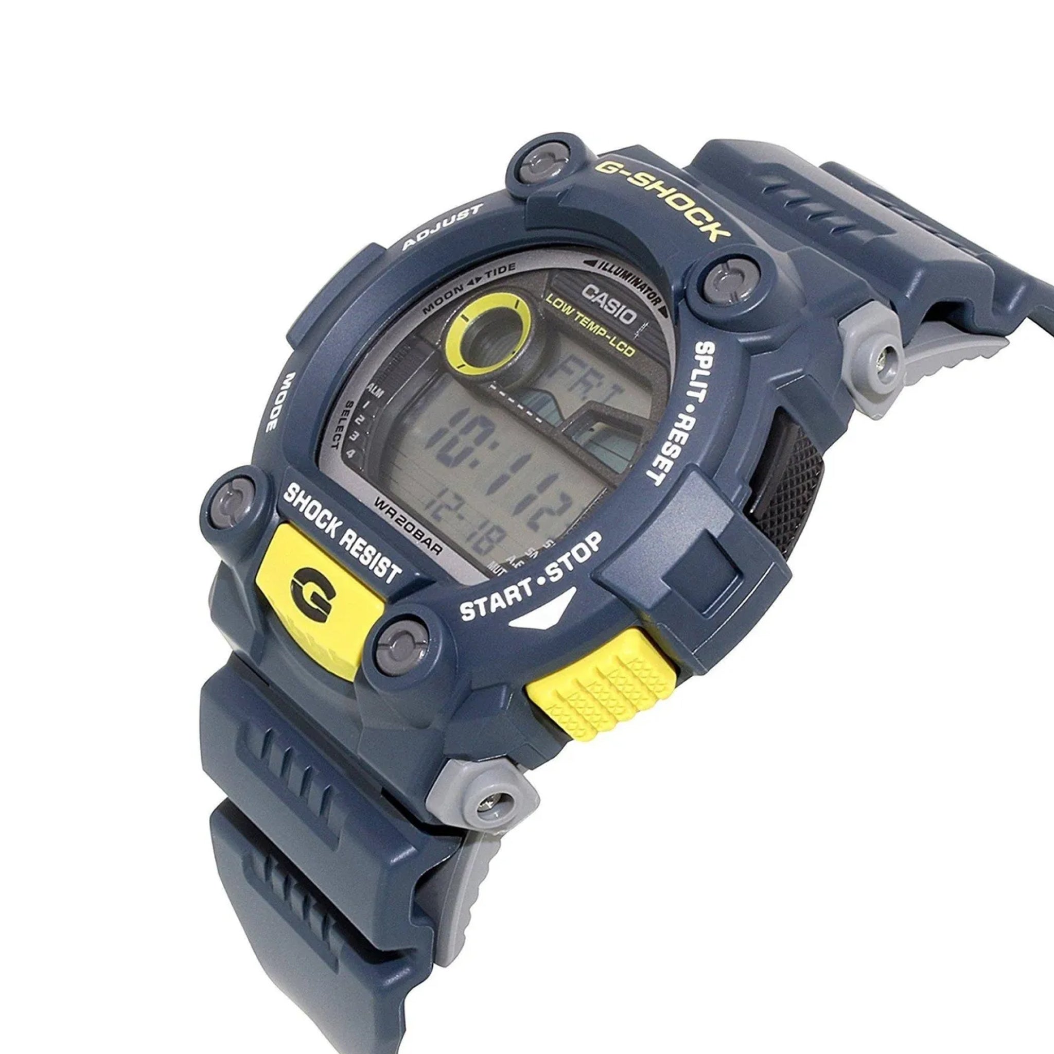 A CASIO G-SHOCK digital watch in blue and yellow colors with a resin band and a digital display showing time, date, and various watch features.