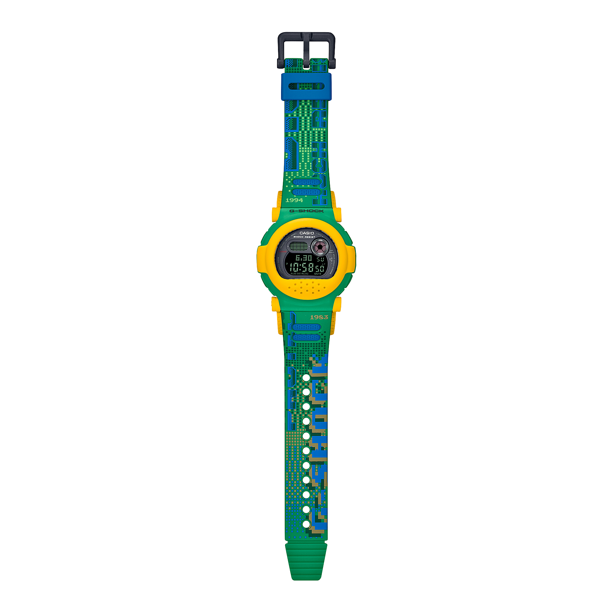 A CASIO G-SHOCK watch with a green band, yellow casing, and digital display showing time and date.
