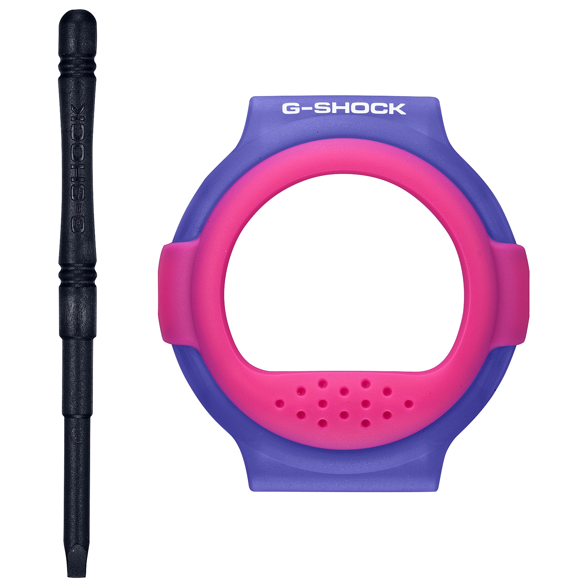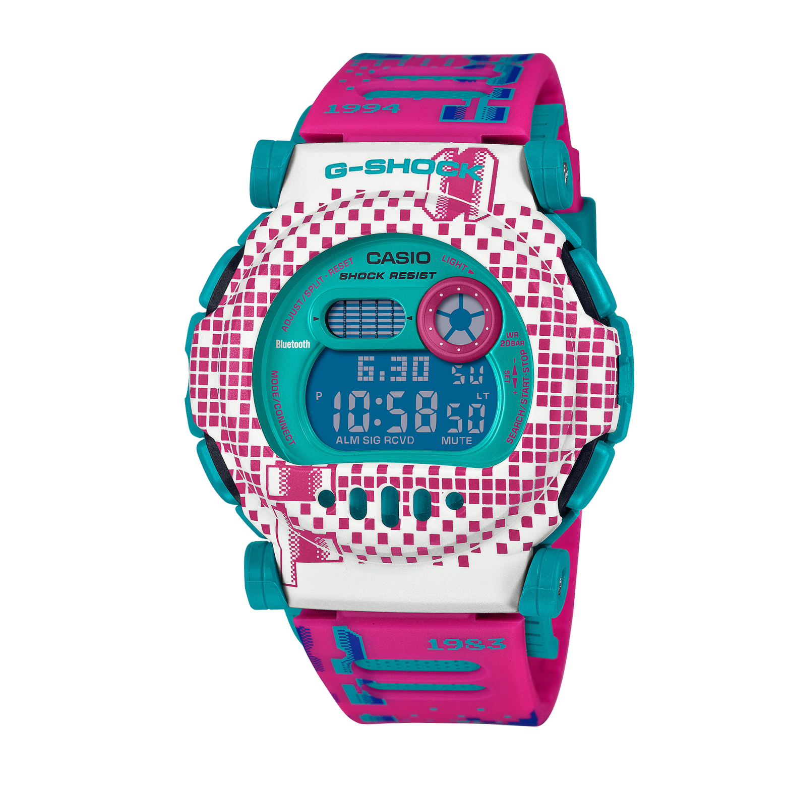 A Casio G-Shock watch with a pink band and digital display, showing time and various features such as world time and stopwatch.