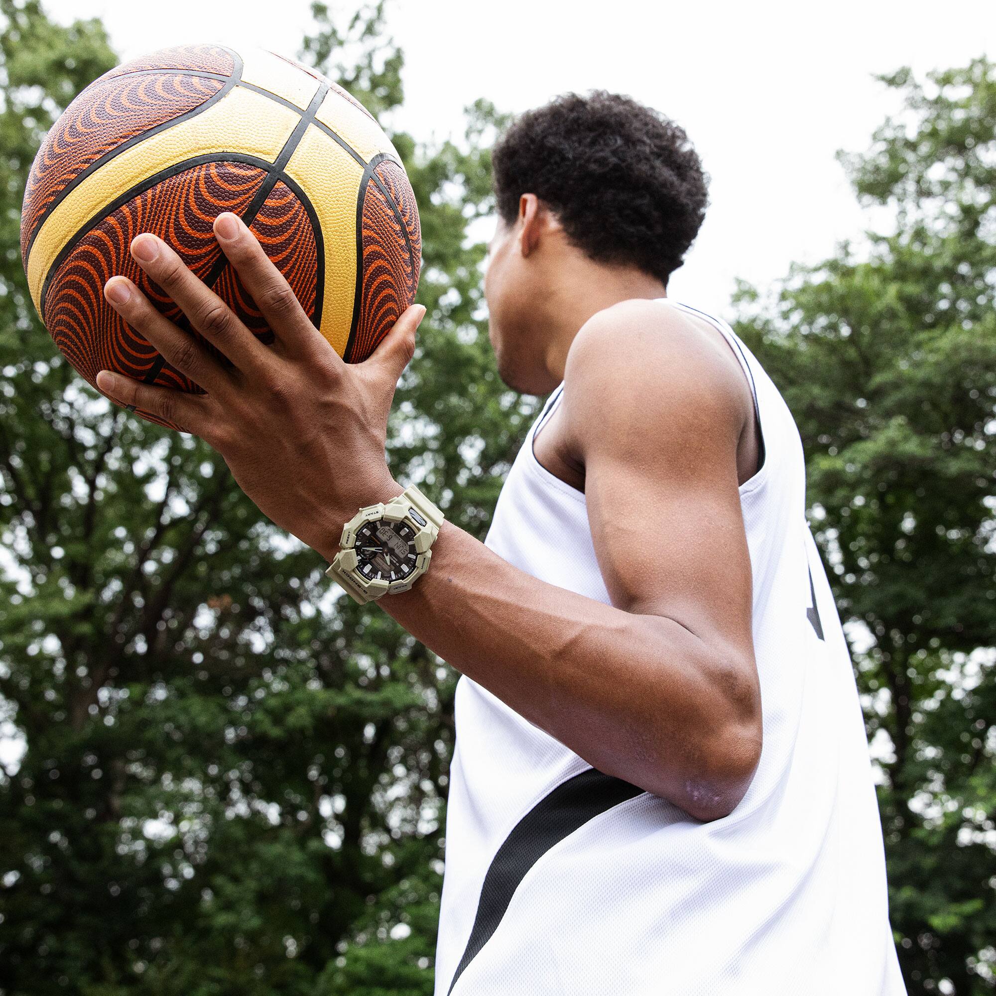 A CASIO G-SHOCK watch with a green band and digital display, showing time and various watch features.