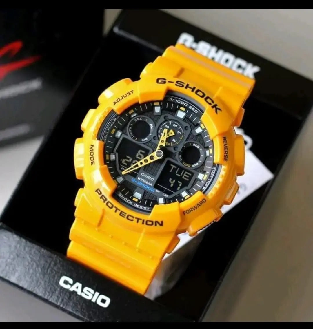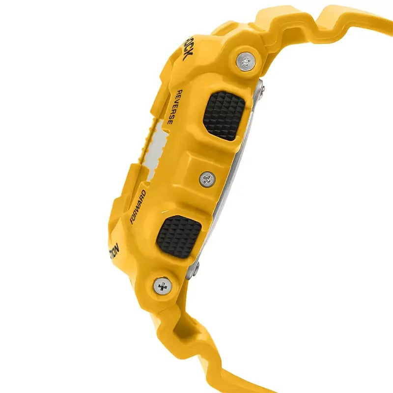 A Casio G-Shock watch with a yellow resin band and case, digital display, and multiple watch features displayed.