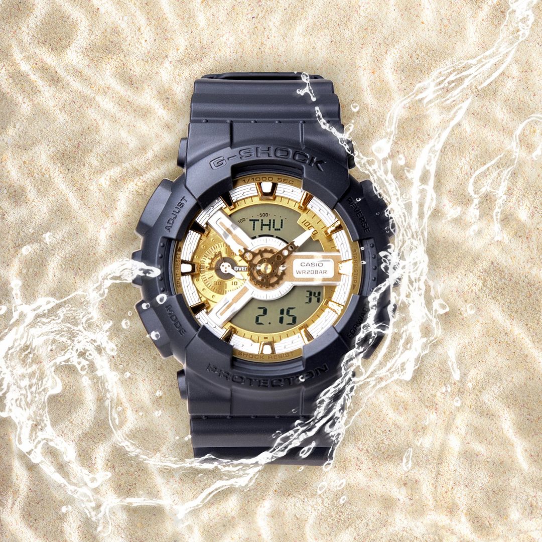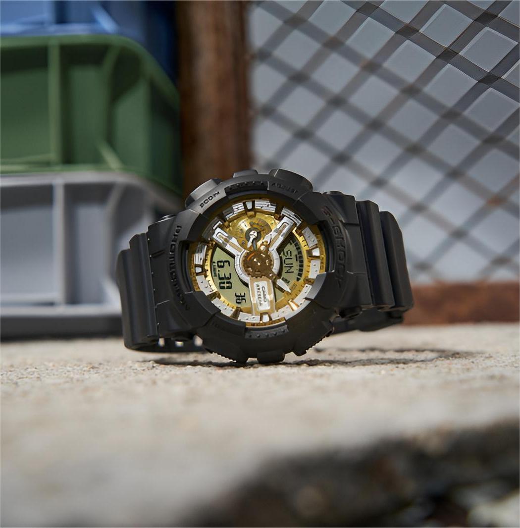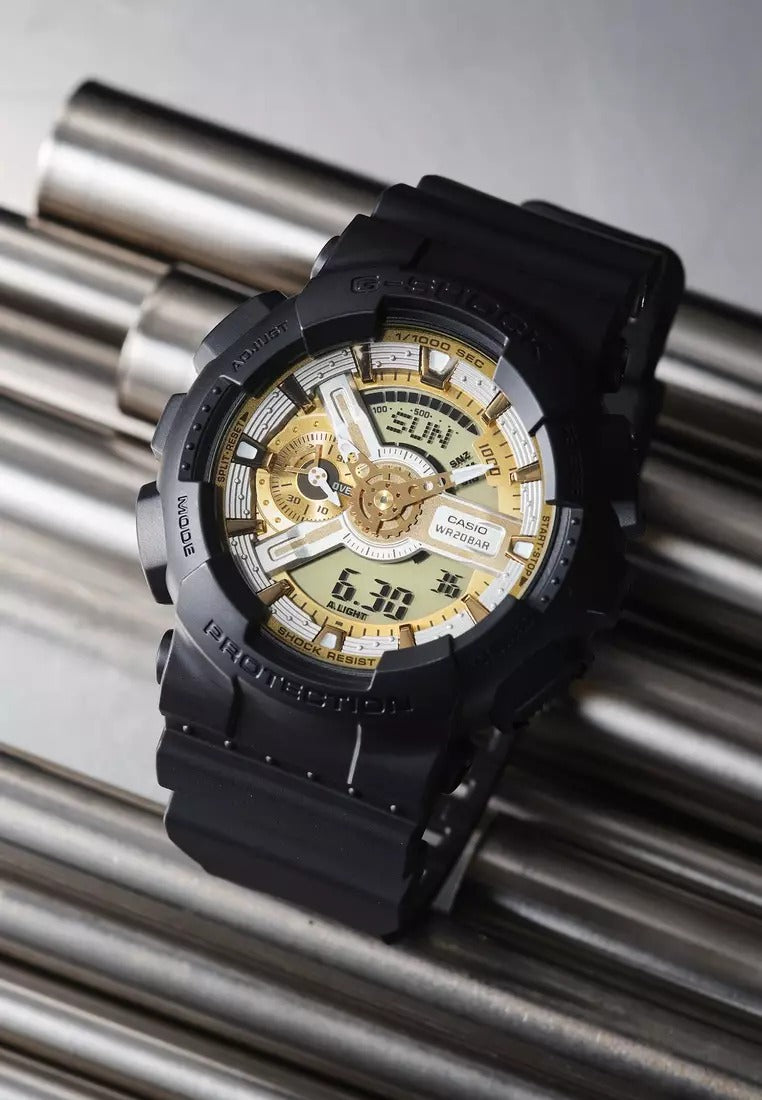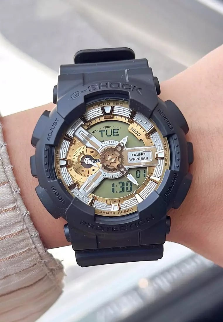 A Casio G-Shock GA-110CD-1A9DR watch with a black band and case, featuring a gold-colored dial and digital display.