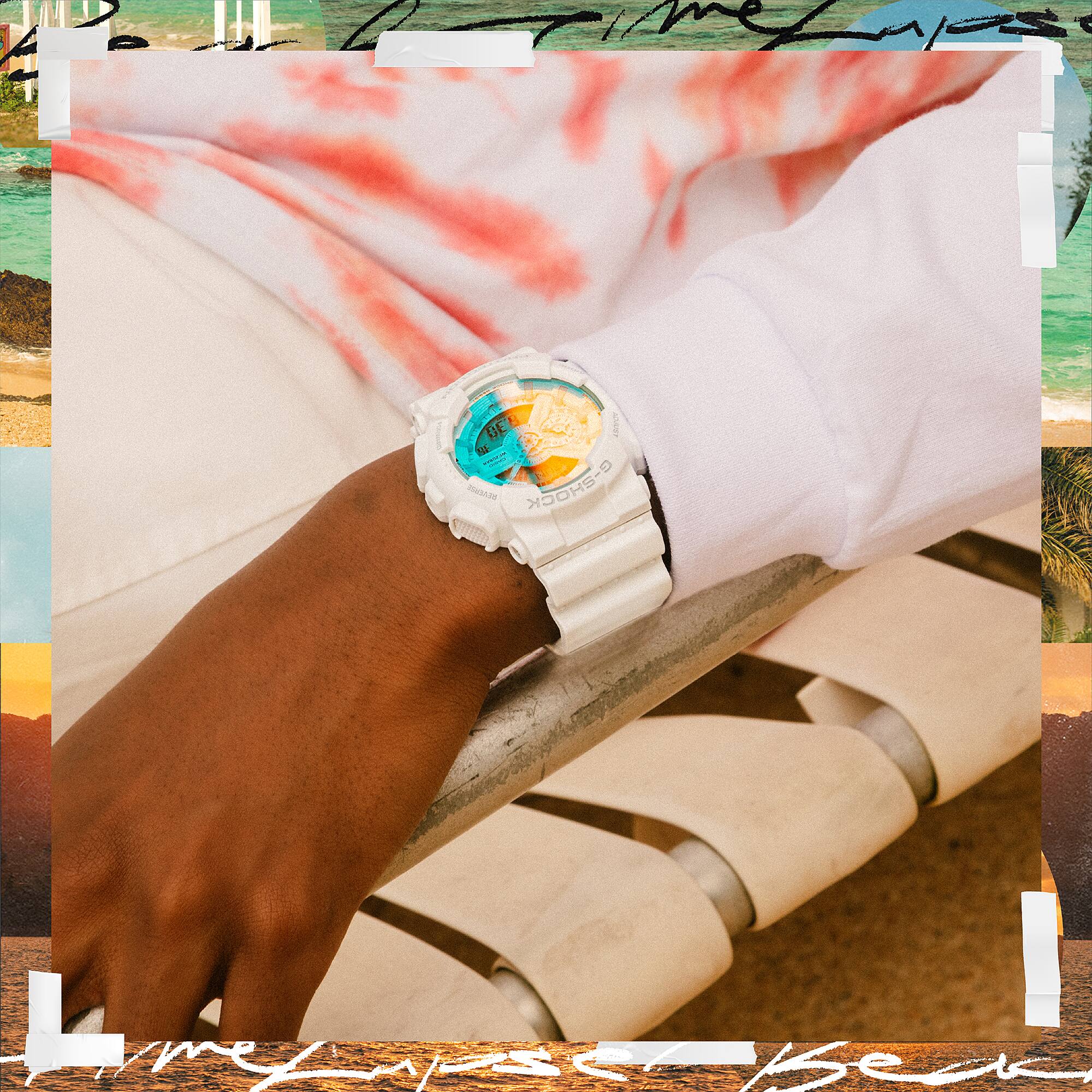 A Casio G-Shock watch with a white band and case, featuring a digital display with a blue and orange color scheme.