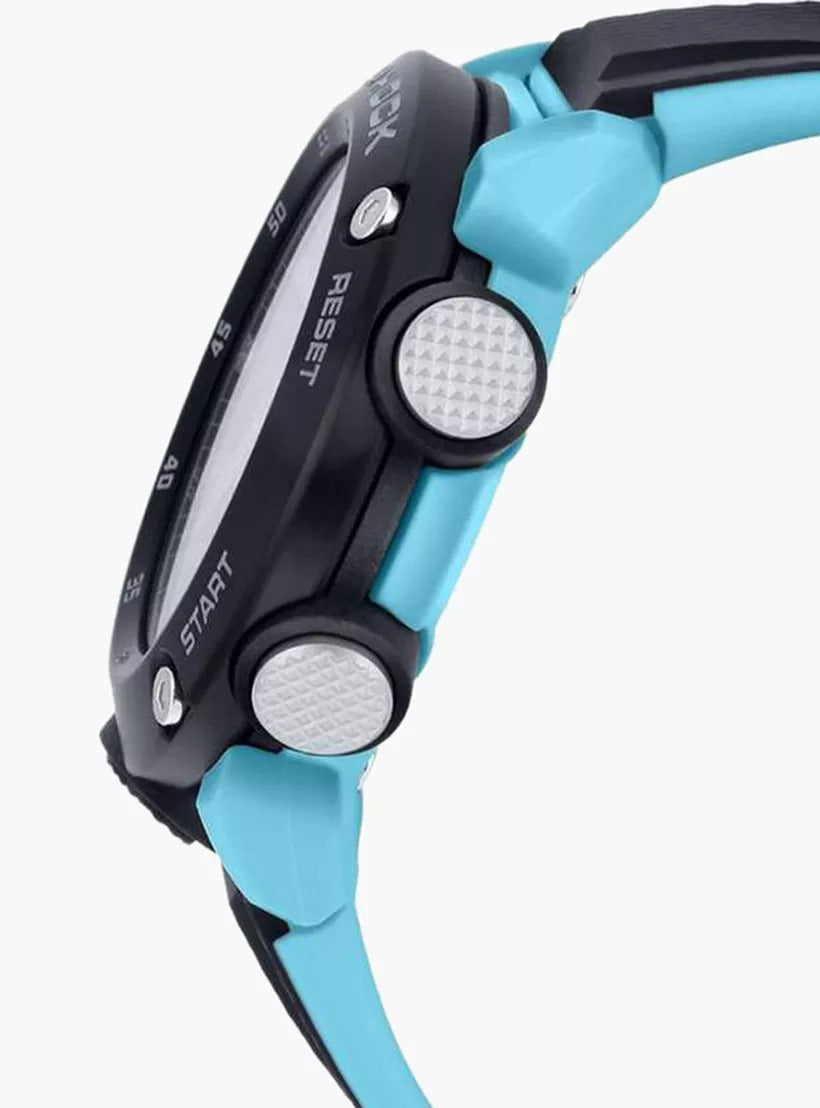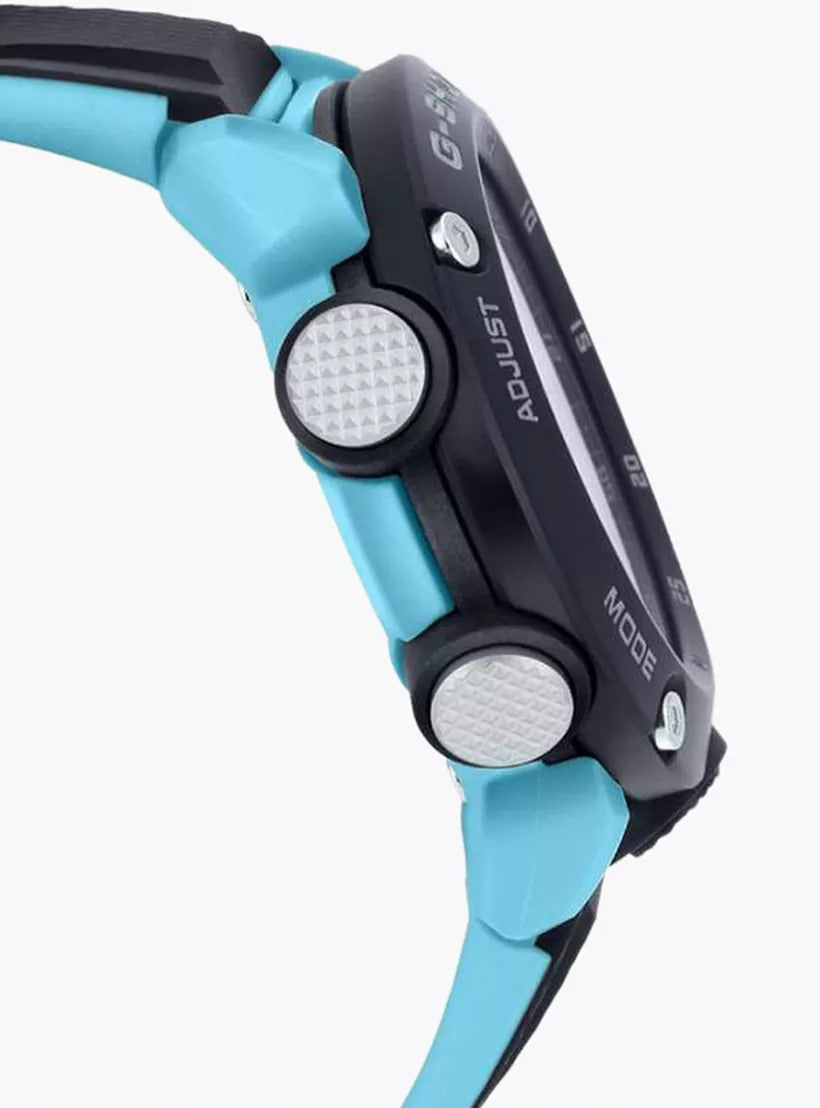 A Casio G-Shock GA-2000-1A2 watch with a black case and blue resin band.