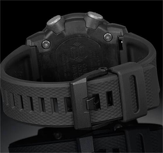 A black CASIO G-SHOCK watch with an analog dial and resin band.