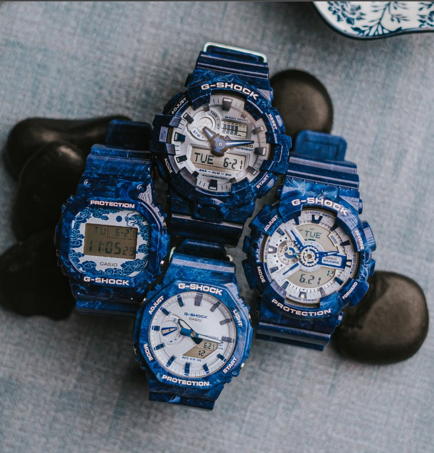 A blue CASIO G-SHOCK watch with a digital display and analog hands, featuring a carbon bezel and resin band.