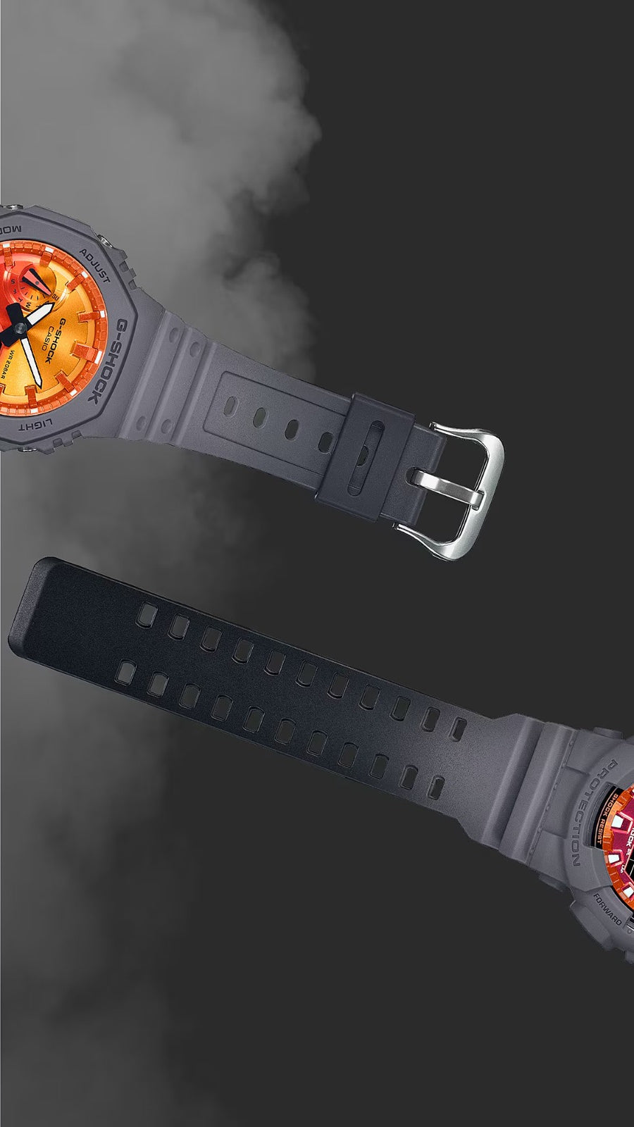 A gray CASIO G-SHOCK watch with a digital display and analog features, including a red and orange dial.