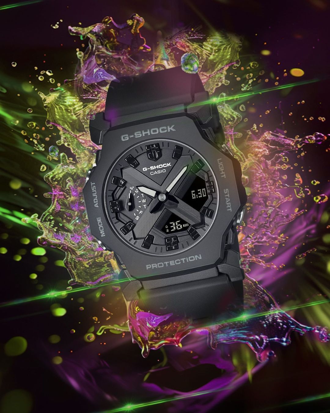 A black CASIO G-SHOCK GA-2300-1ADR watch with an analog dial, digital display, and resin band.