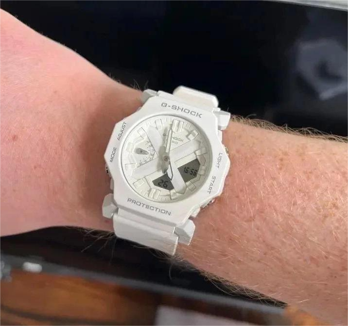 A white CASIO G-SHOCK GA-2300-7ADR watch with a resin band and digital display.