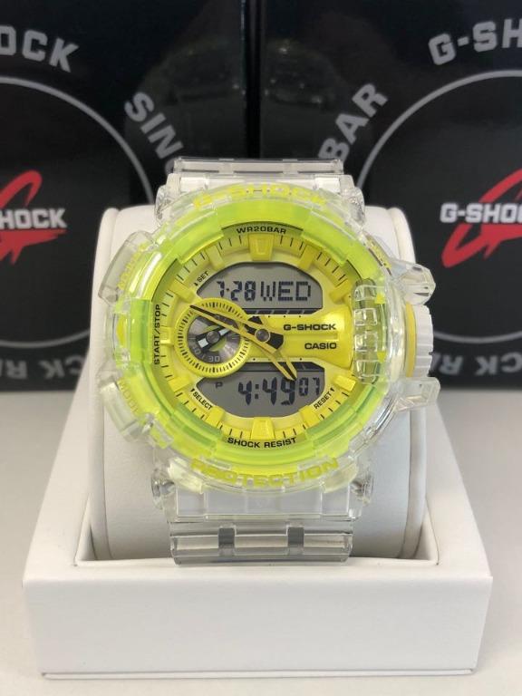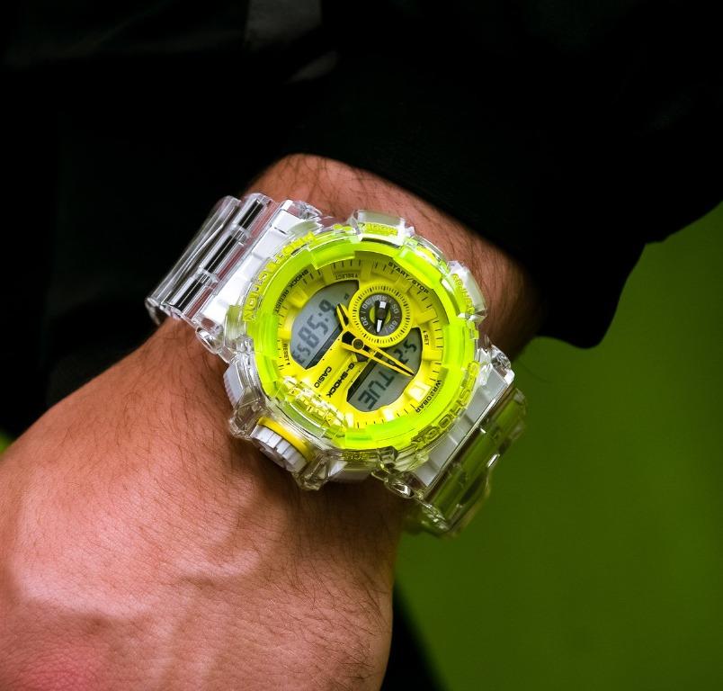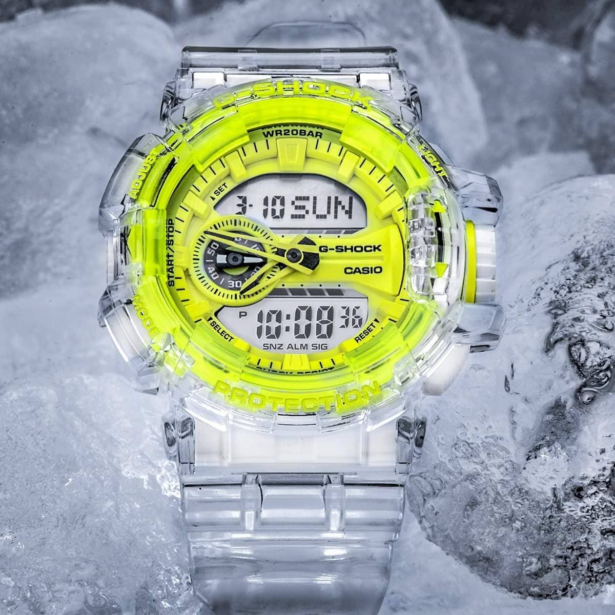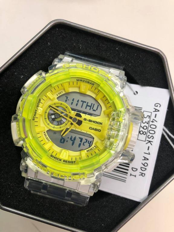 A Casio G-Shock GA-400SK-1A9DR digital watch with a green band and dial, alongside a clear resin case.