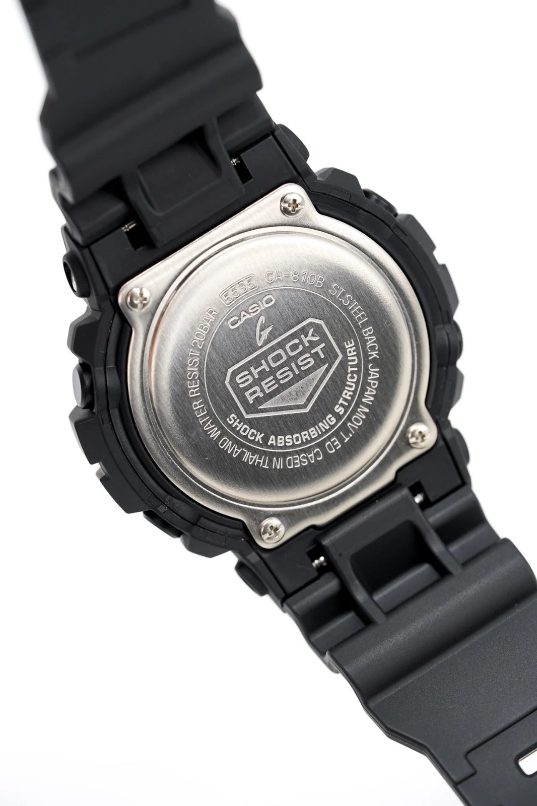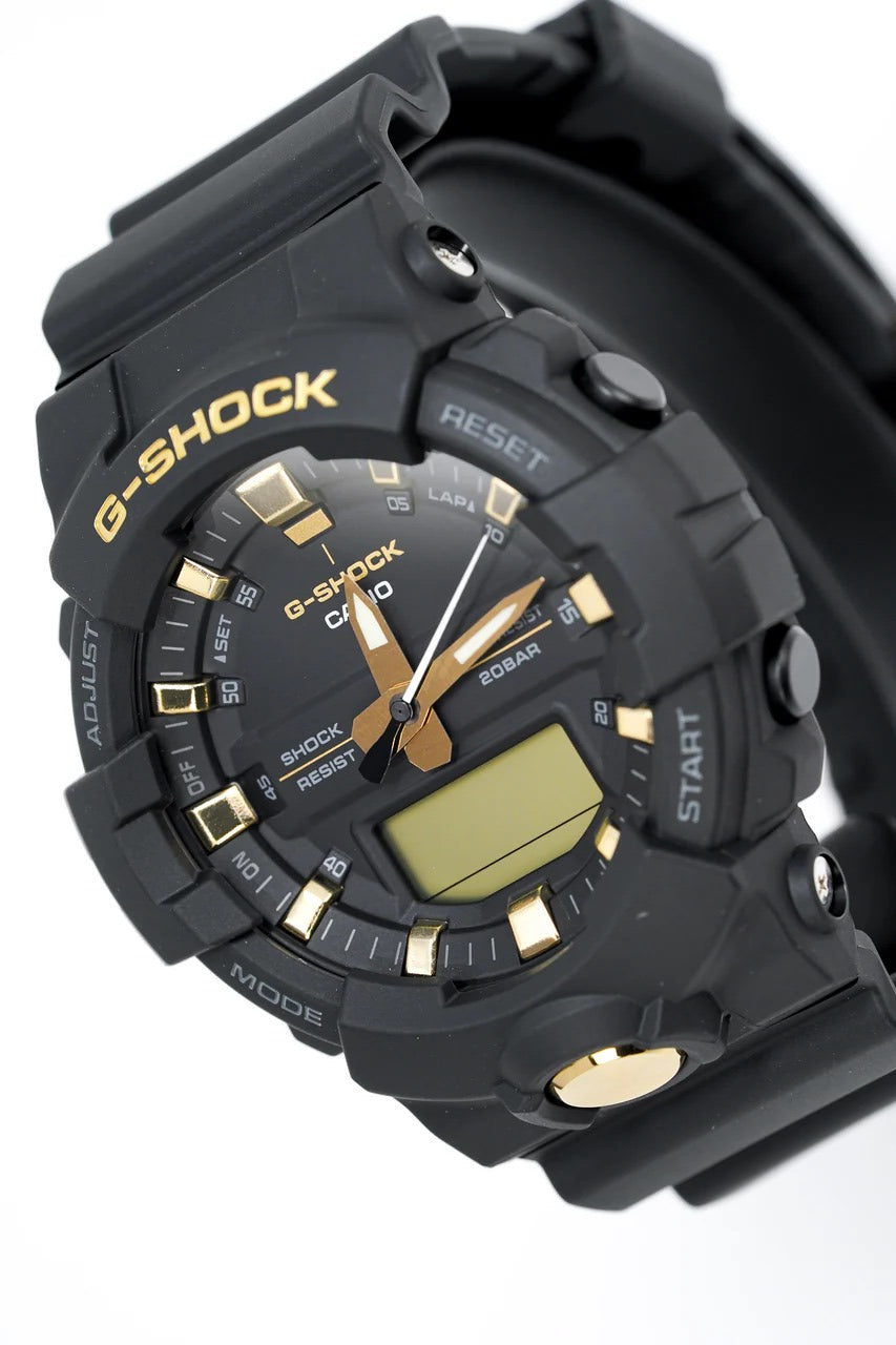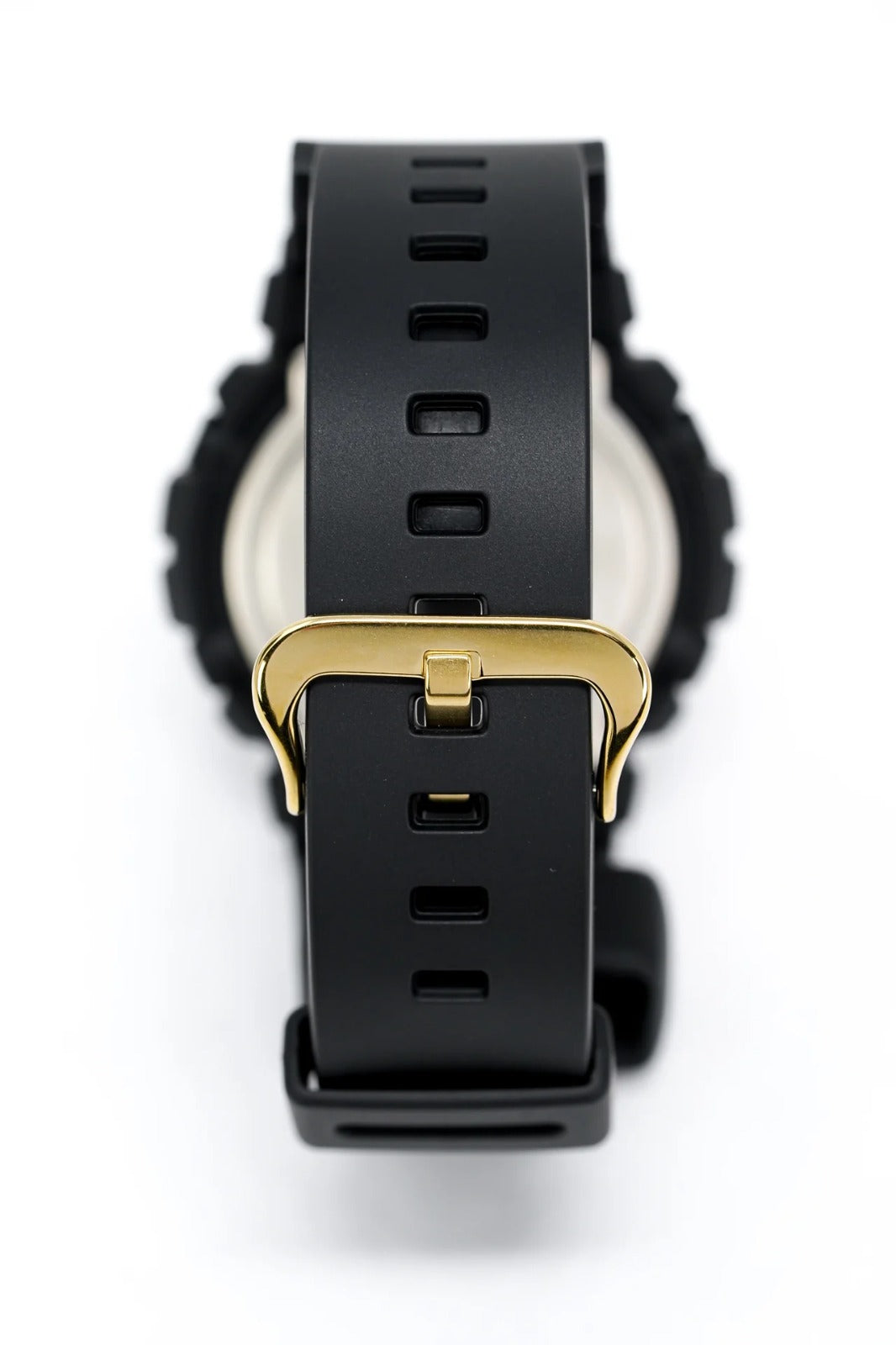 ميناء أسود تناظري-رقمي، بعقارب ذهبية وعلامات معدنية. شاشة رقمية عند موضع الساعة السادسة. زجاج معدني مقاوم للخدش.
