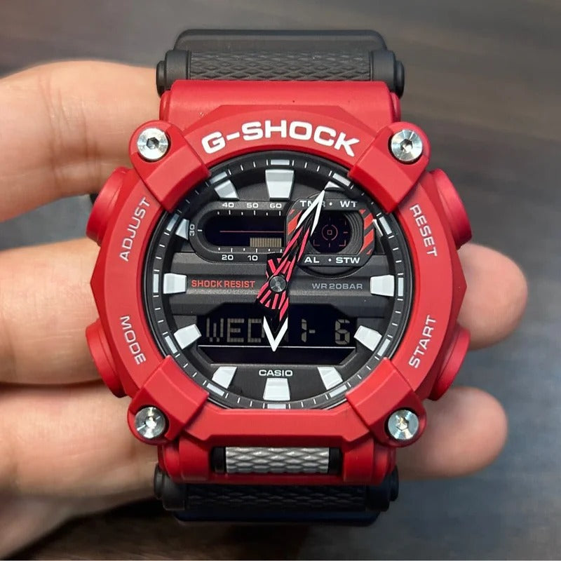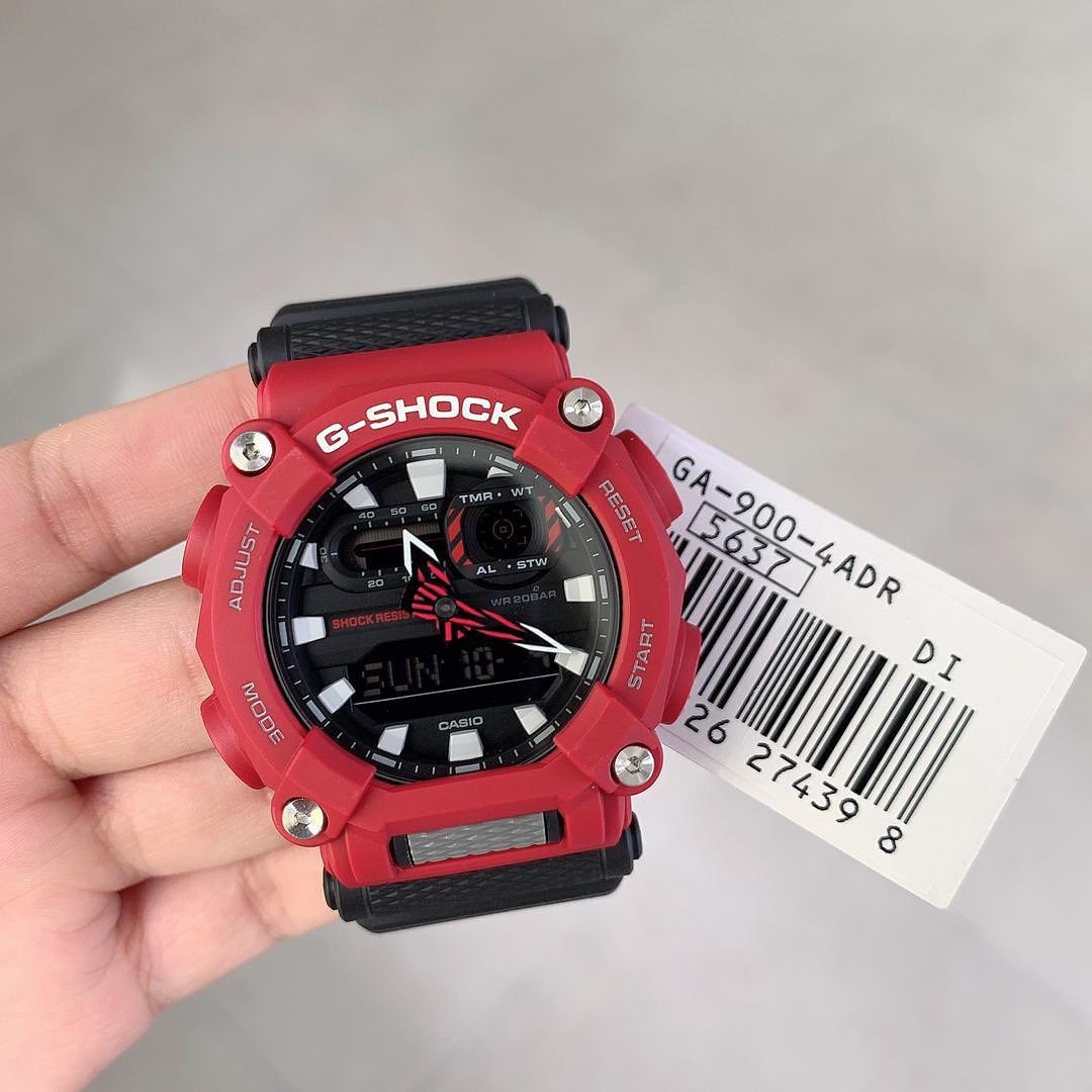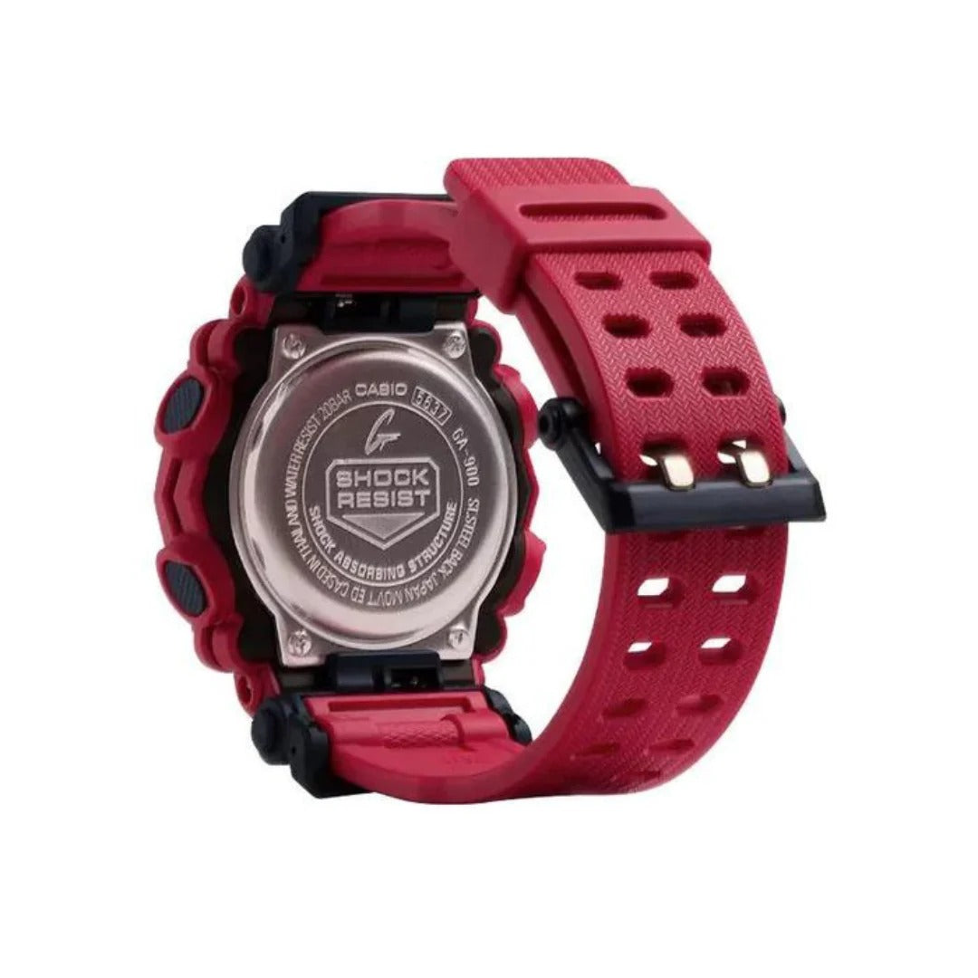 A red and black CASIO G-SHOCK GA-900-4ADR digital analog watch with a resin band and a digital display showing the time.