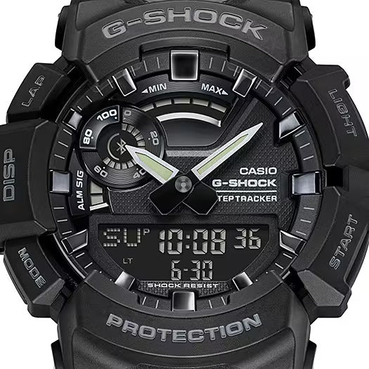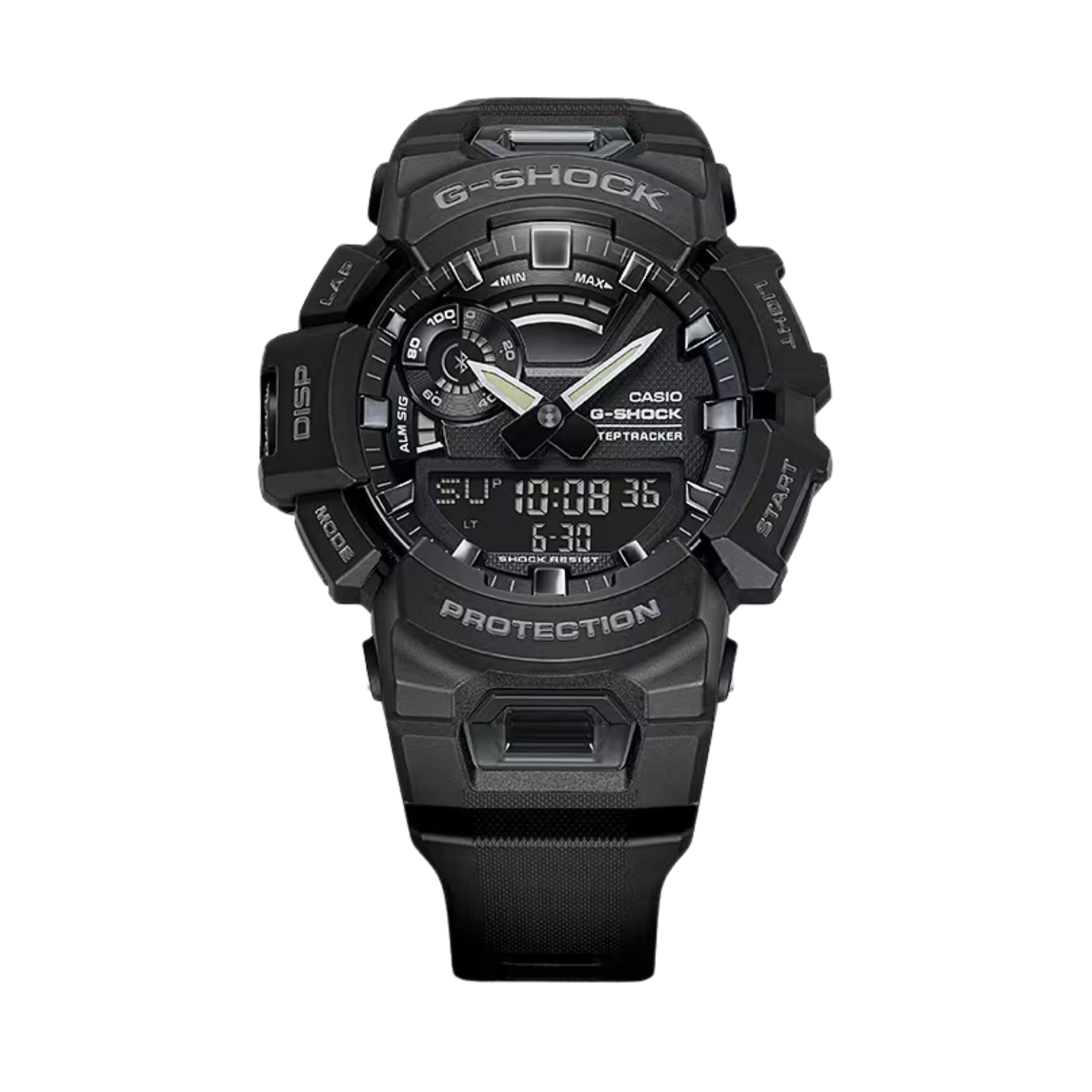 A black CASIO G-SHOCK GBA-900-1ADR watch with a digital display, analog hands, and multiple watch features visible.