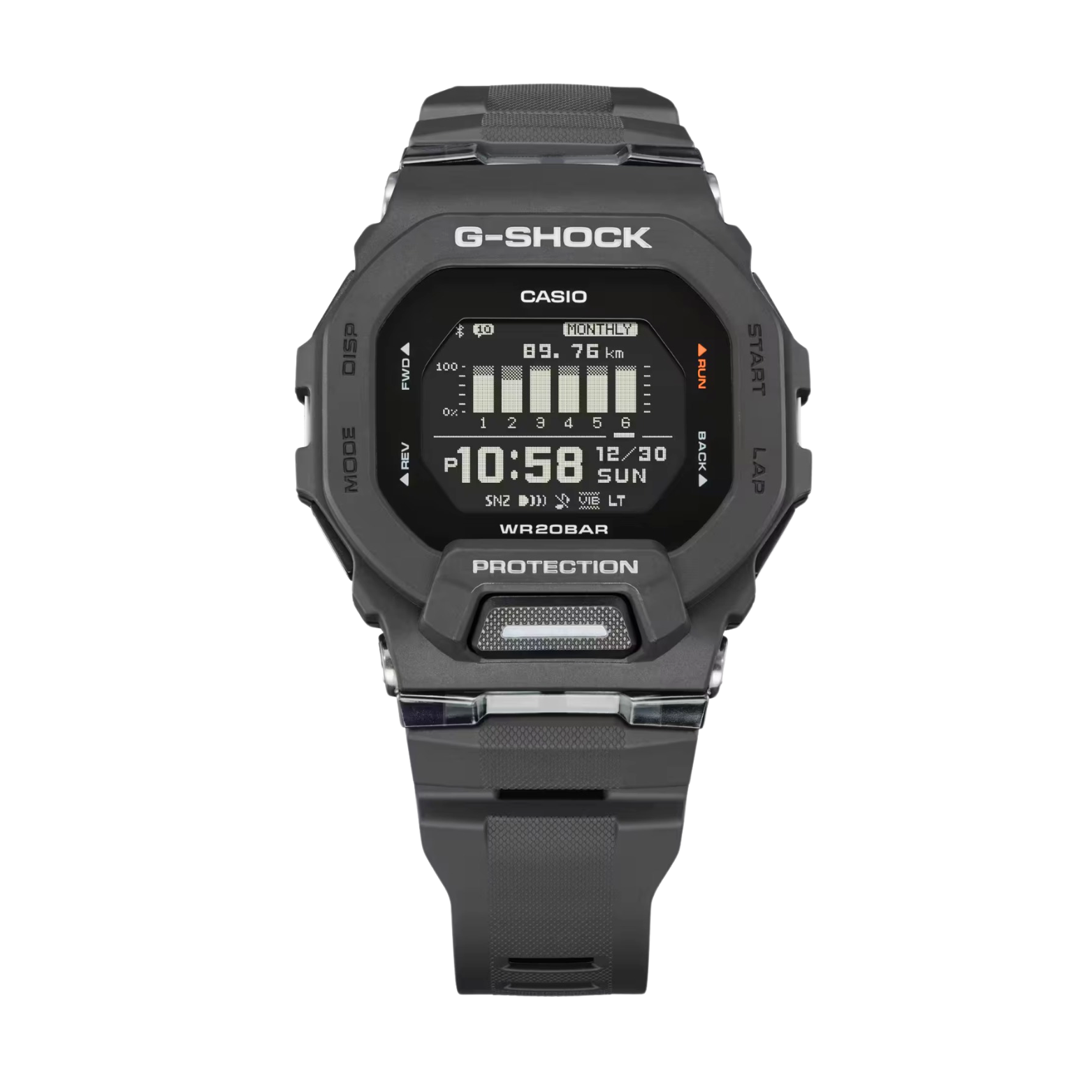 A black CASIO G-SHOCK GBD-200-1D digital watch with a resin band and a digital display showing time, date, and various features.