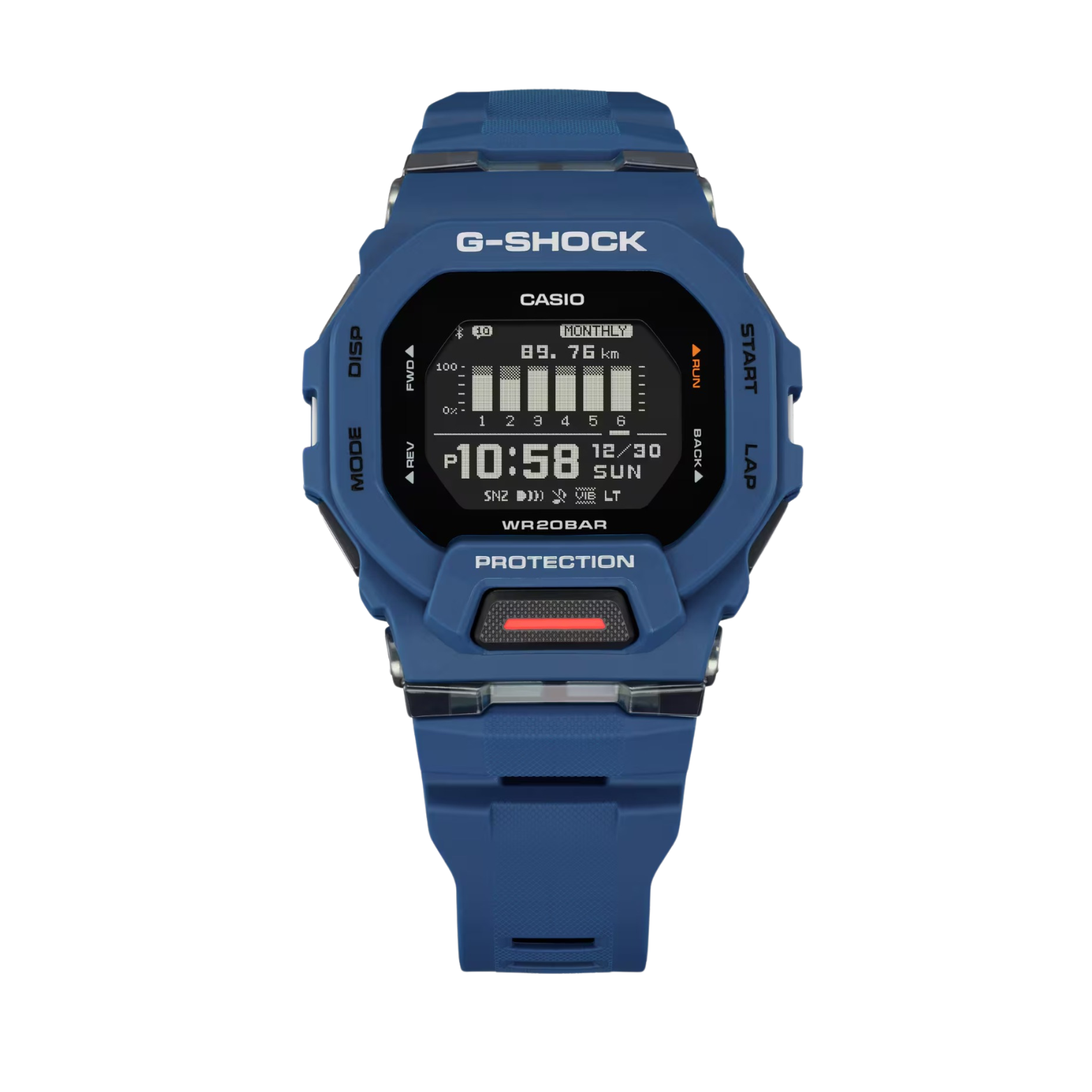 A blue CASIO G-SHOCK GBD-200-2DR digital watch with a resin band and a resin case, displaying time, date, and various watch features on its LCD screen.