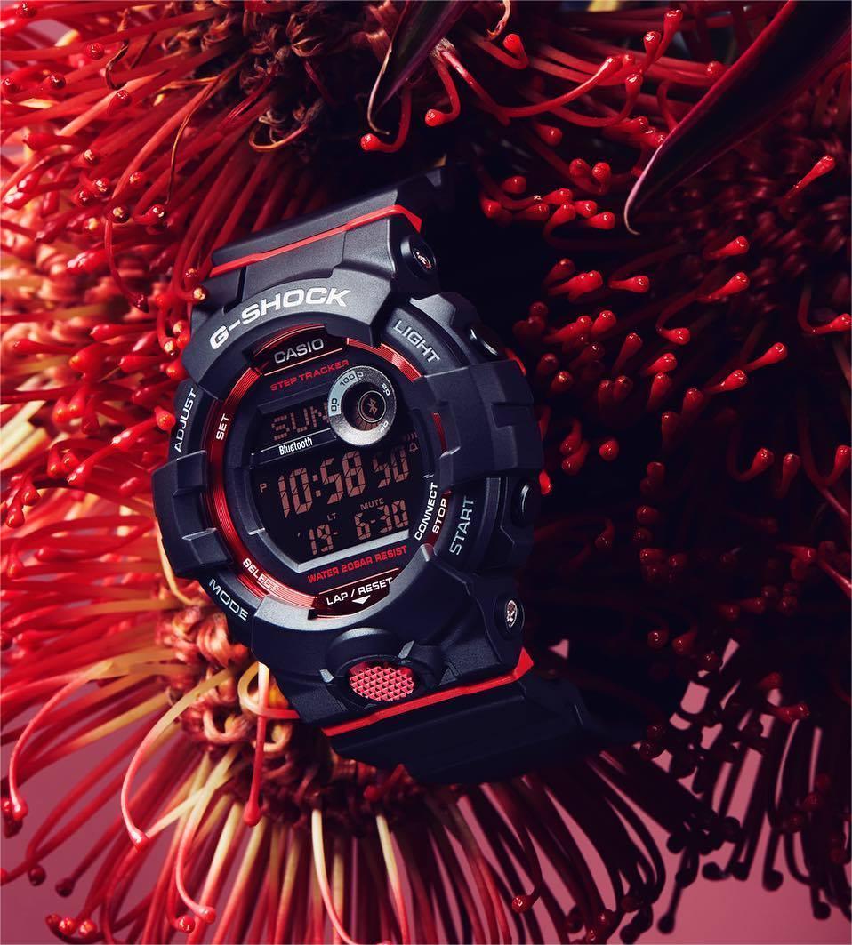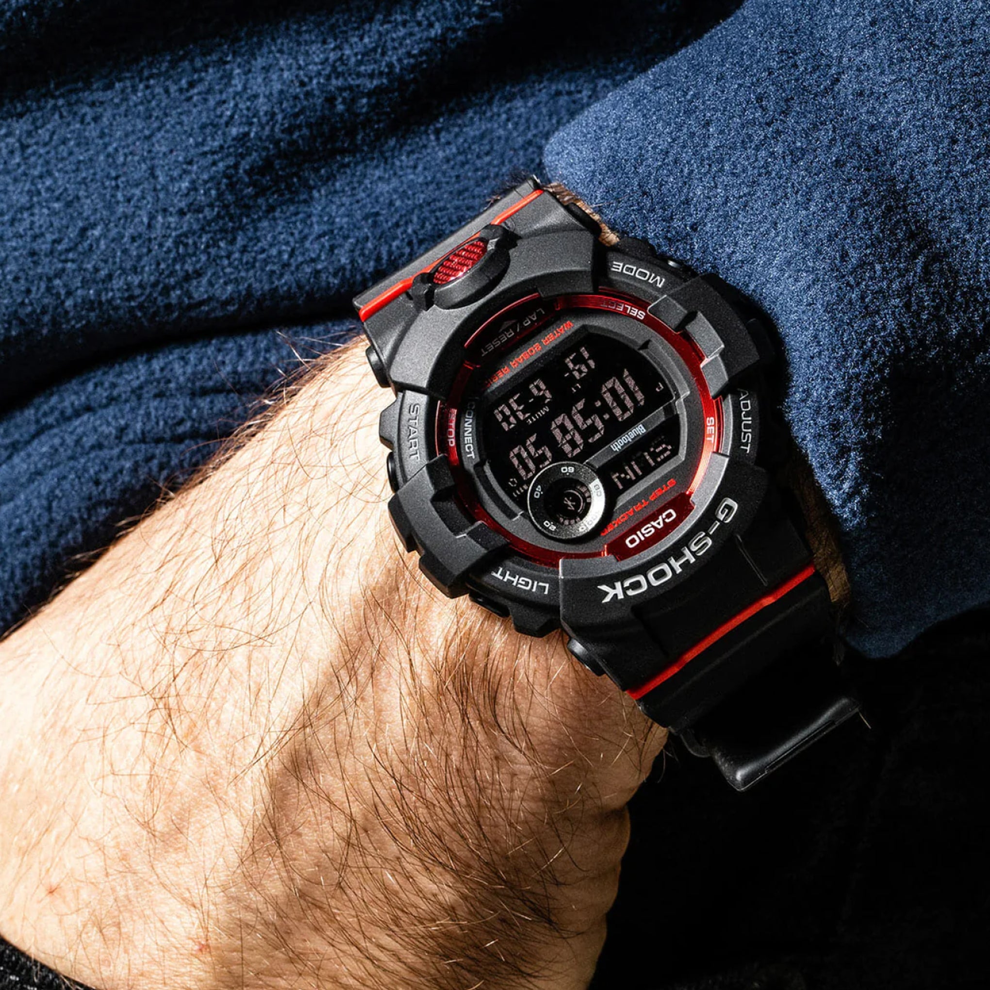A black CASIO G-SHOCK watch with red accents, digital display, and step count feature.