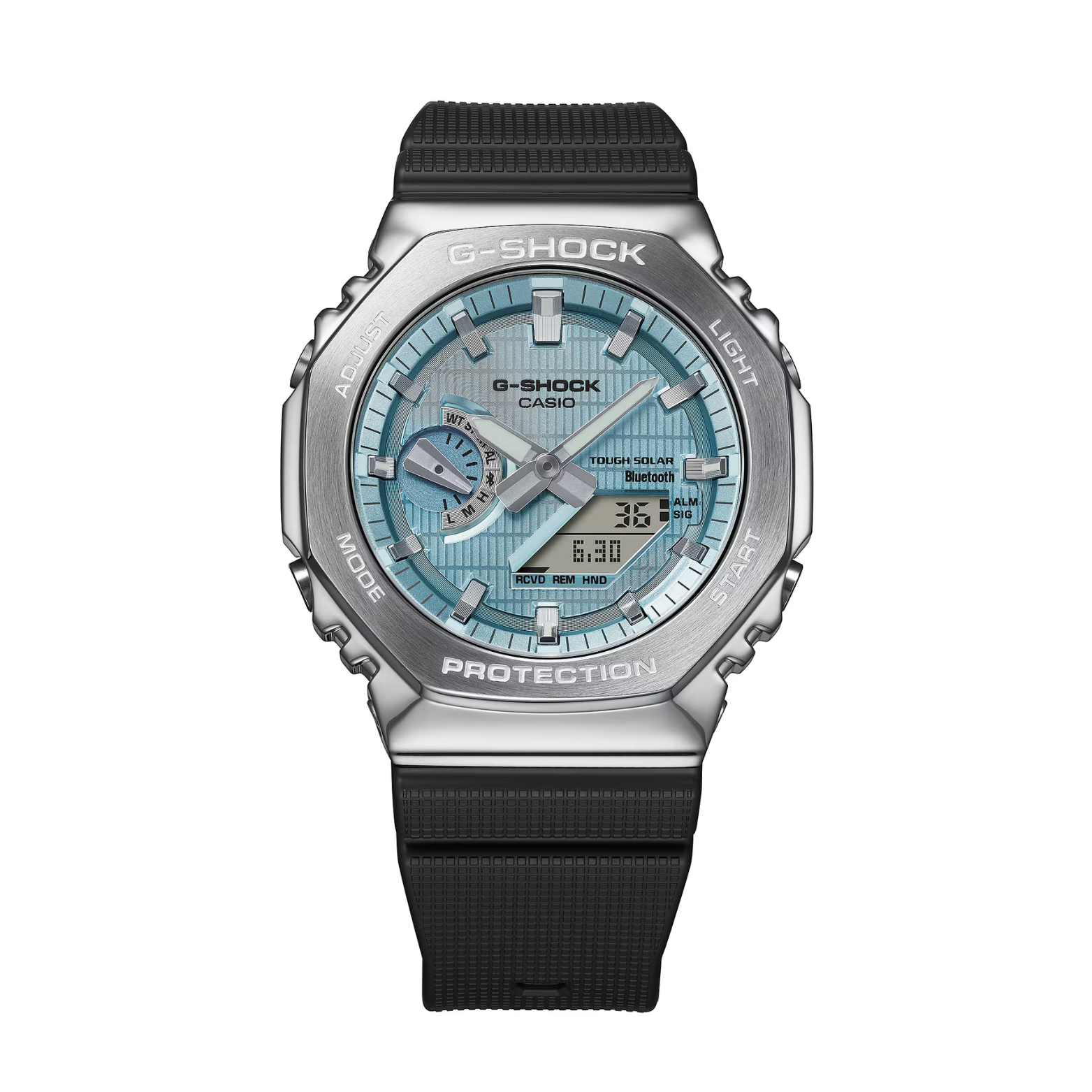 Casio GBM-2100A-1A2, GBM2100 blue, metal covered CasiOak, G-SHOCK Tough Solar Bluetooth, G-SHOCK 200M water resistant, Super Illuminator double LED, bio-based resin band, stainless steel bezel G-SHOCK, analog digital 2100 series, Casio Watches app world time, slim CasiOak metal solar.