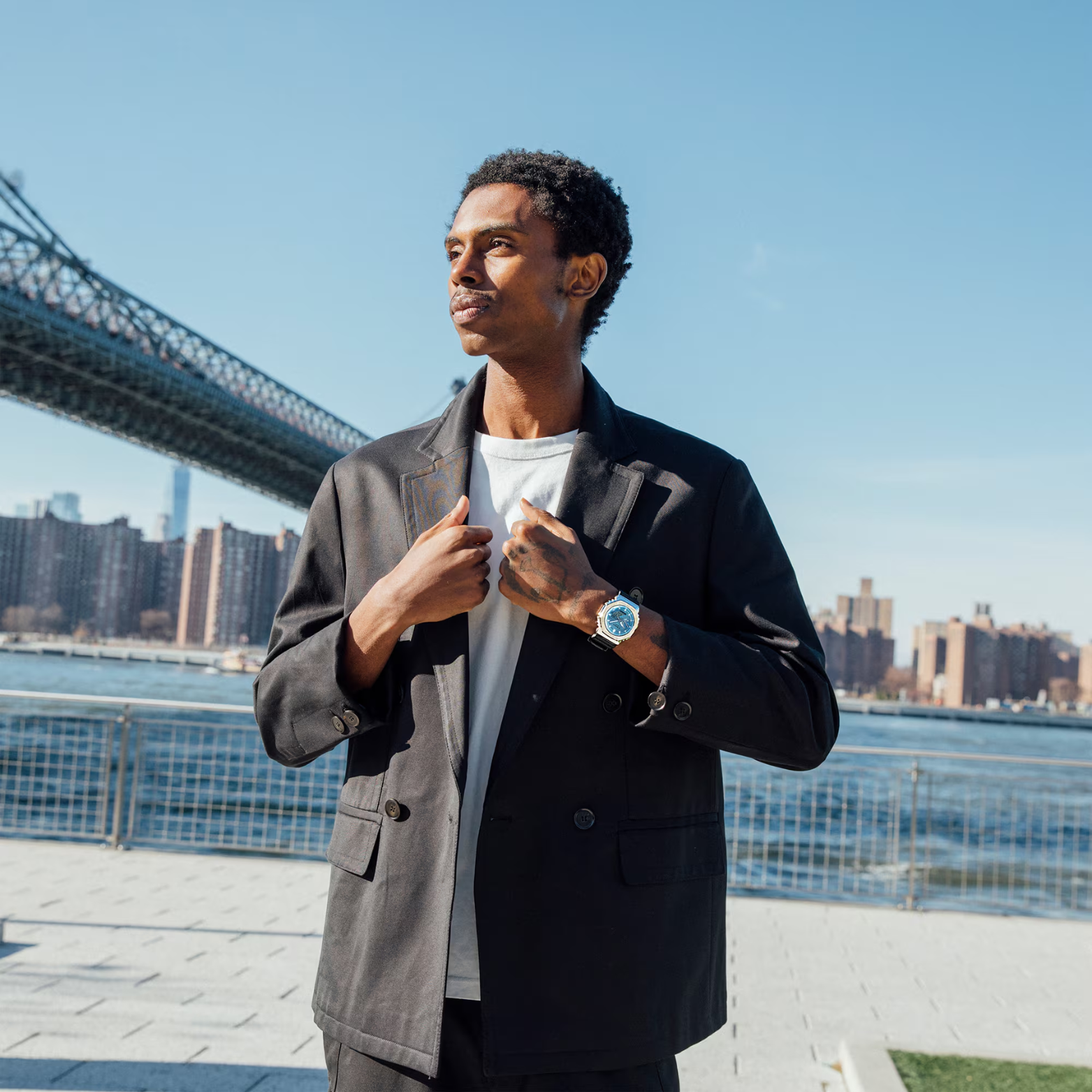Style Notes: Octagonal metal look, blue vapor-deposition dial, stealthy black case/band