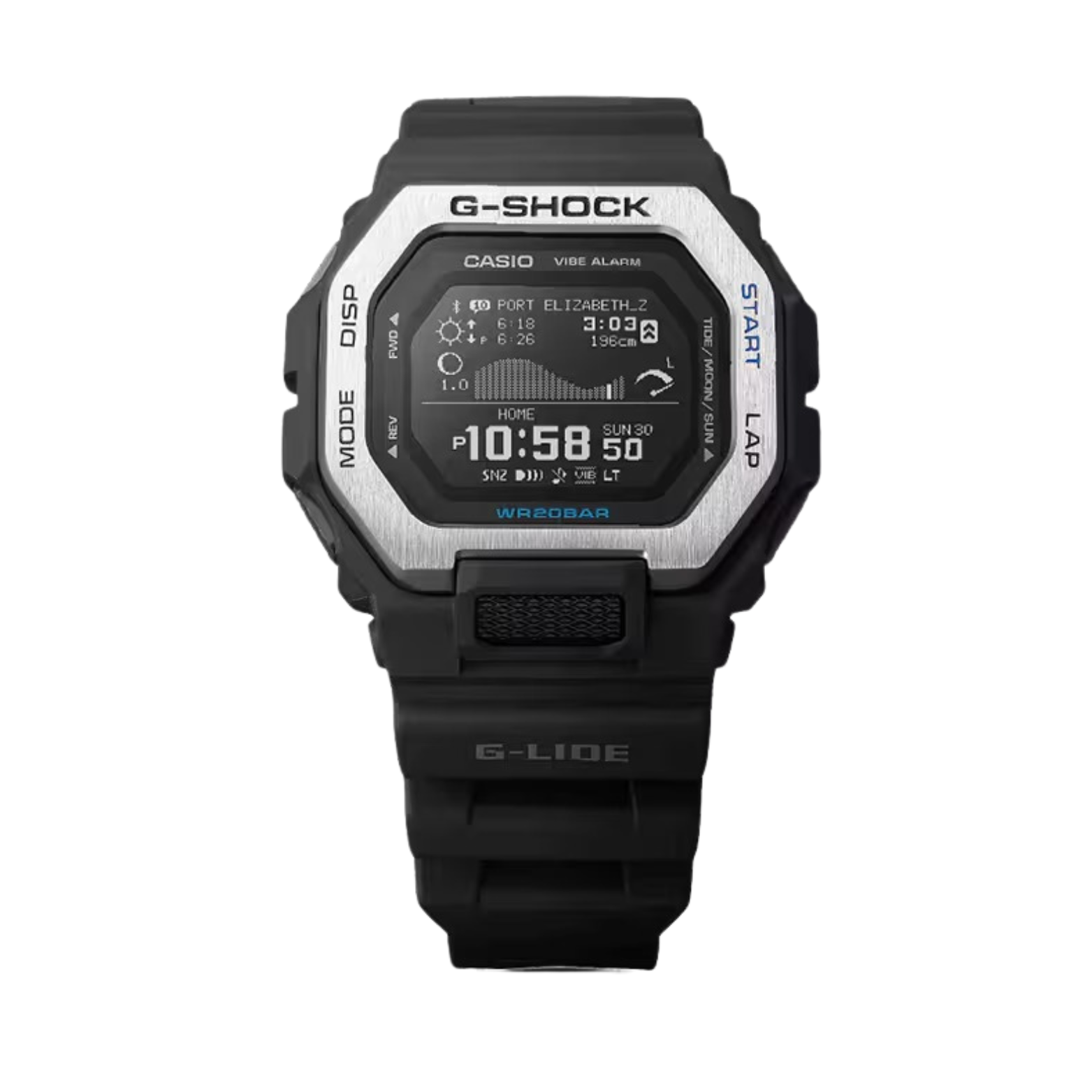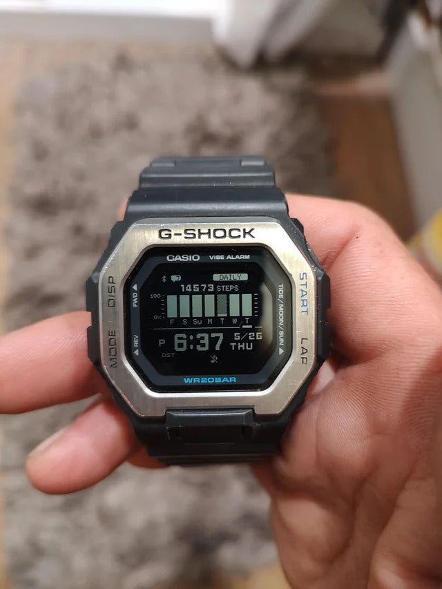 A black CASIO G-SHOCK watch with a digital display, showing time, date, and various smart features.