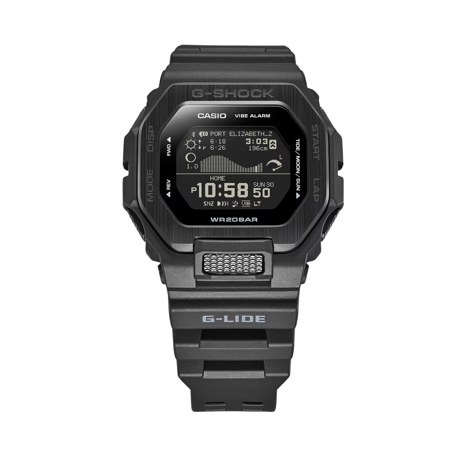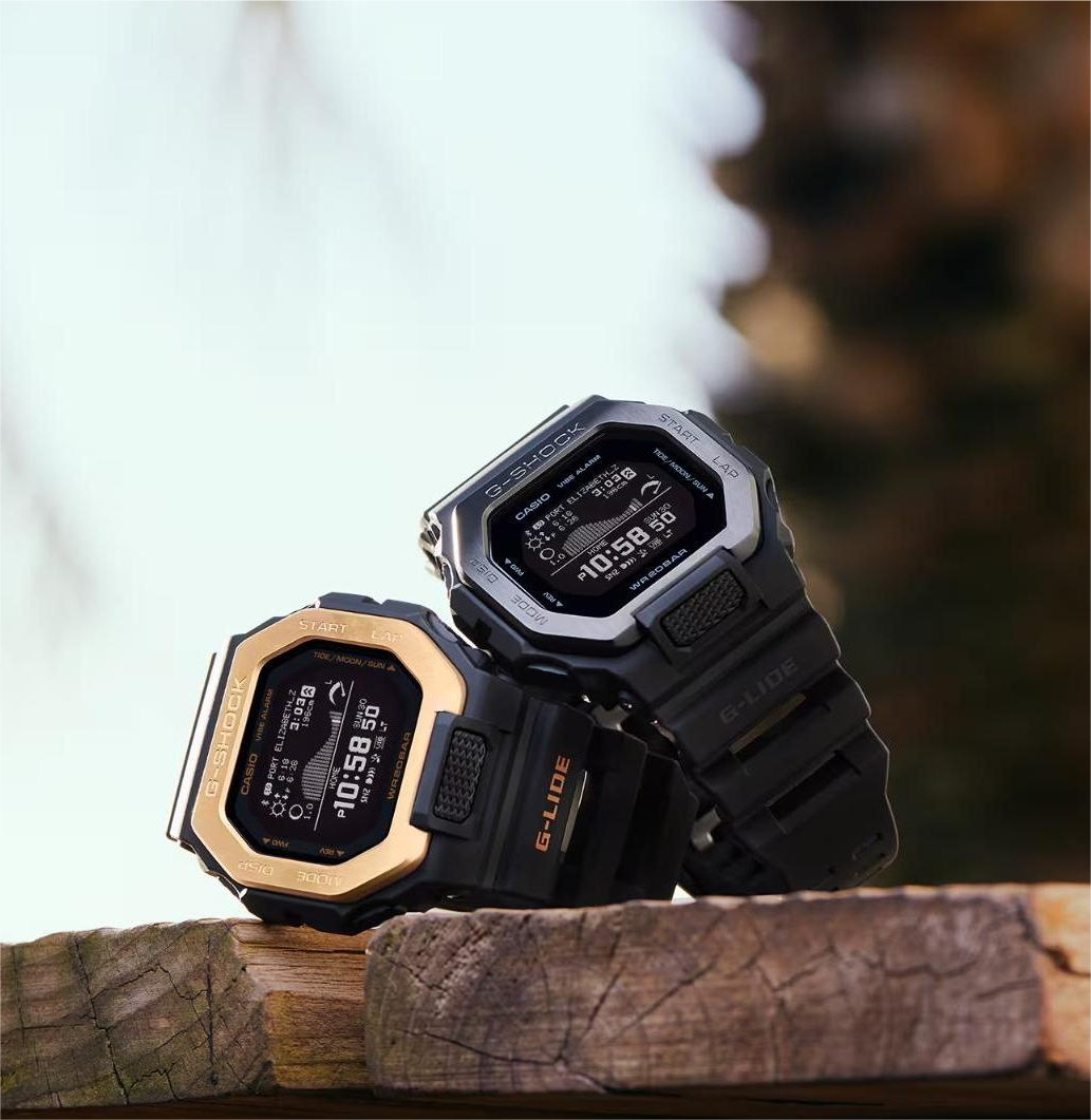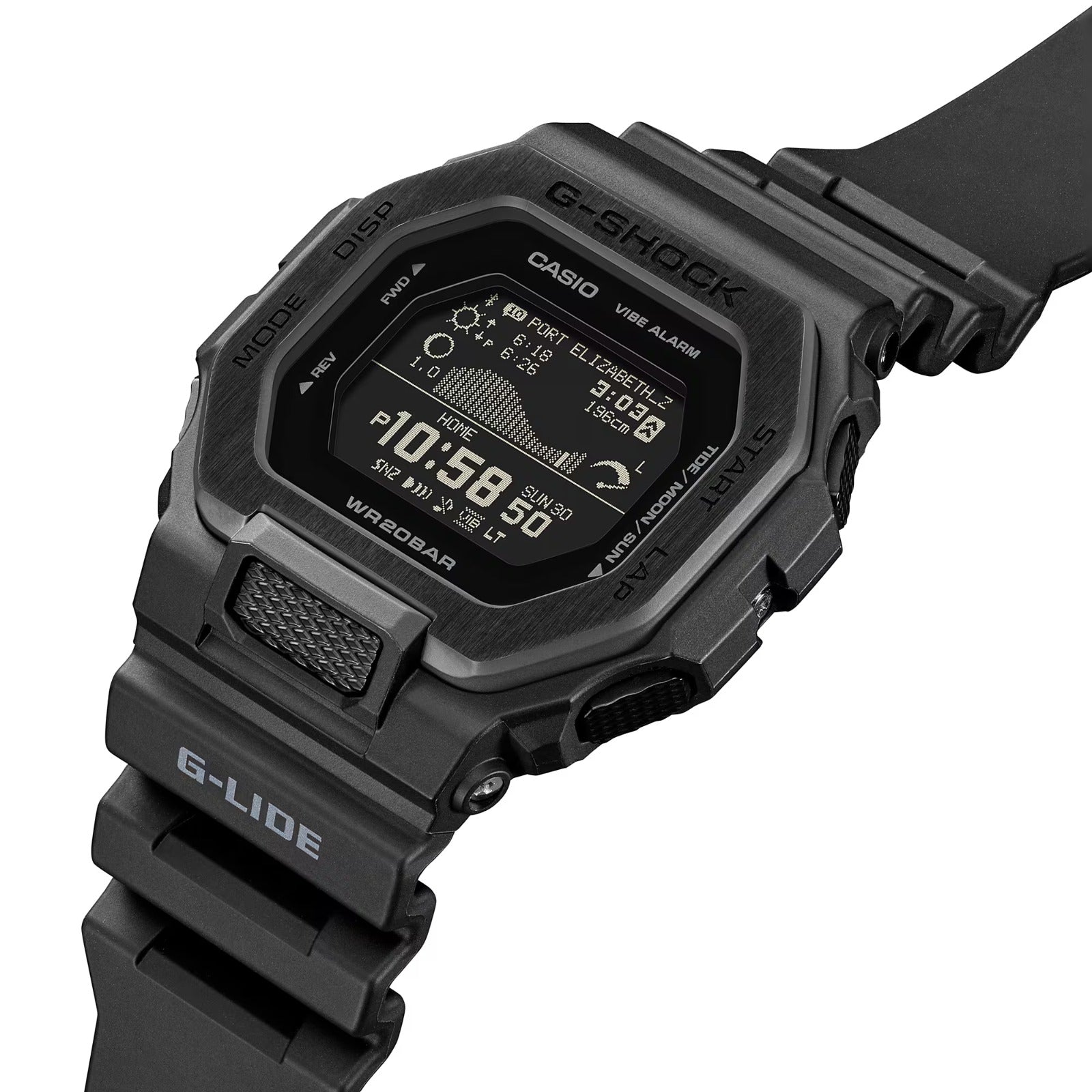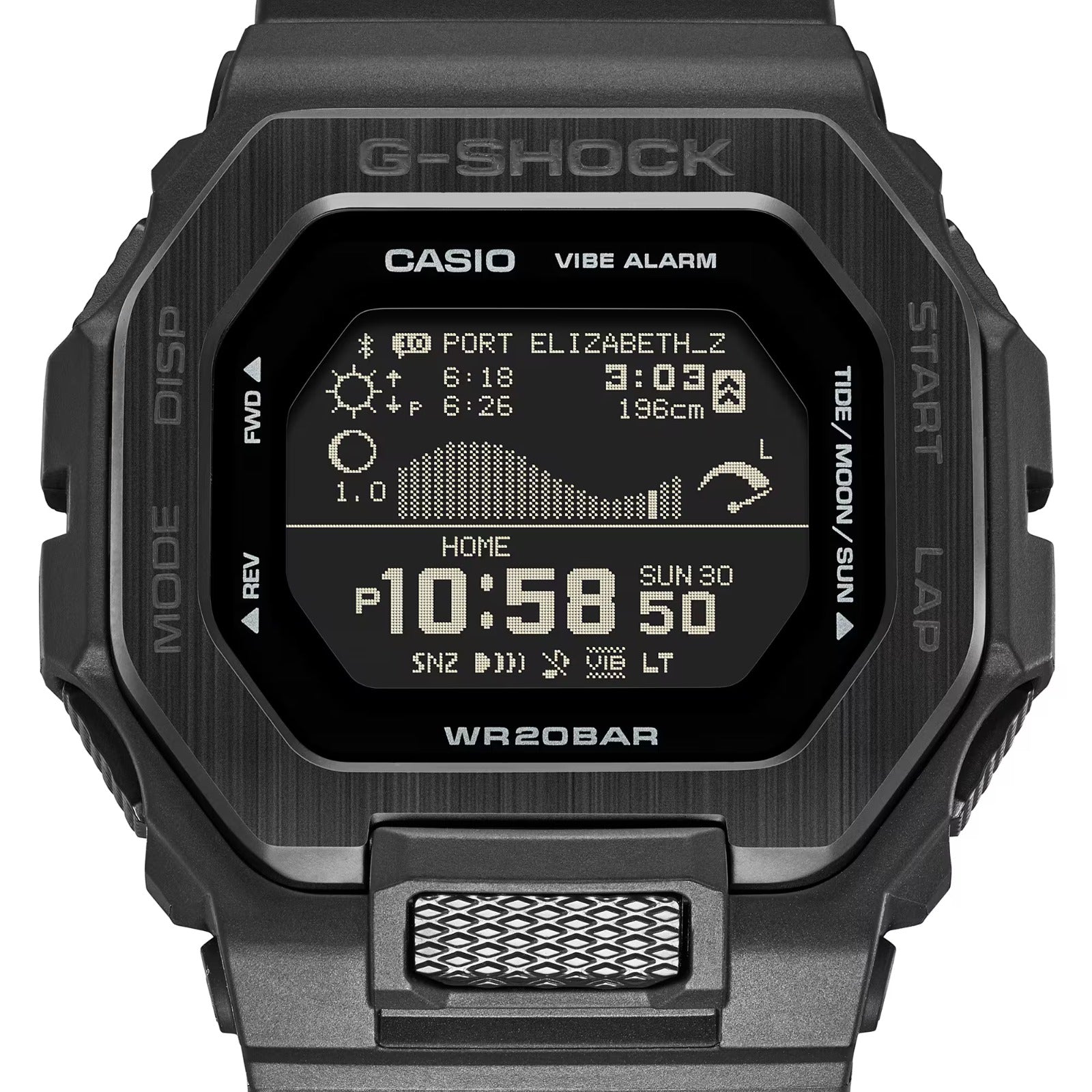 A black CASIO G-SHOCK watch with a digital display, showing time, date, and various smart features.