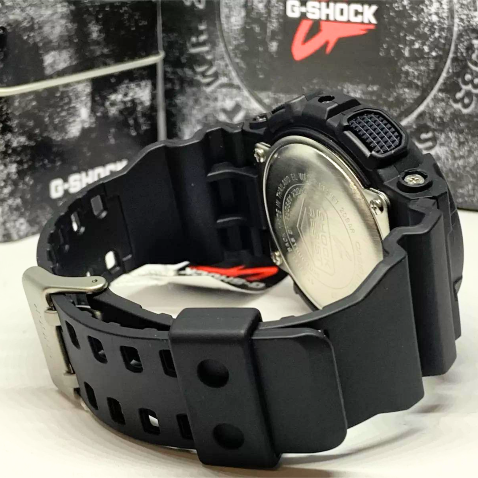 A black CASIO G-SHOCK analog-digital watch with a resin band and digital display showing time, date, and various watch features.