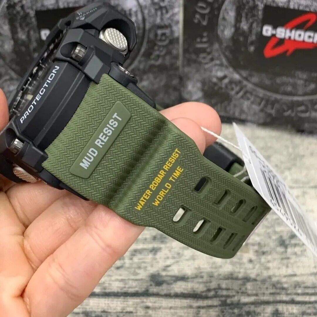 A CASIO G-SHOCK watch with a black case and green band, featuring a digital display and multiple watch hands.