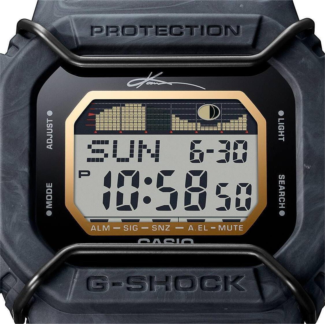 A black CASIO G-SHOCK digital watch with a resin band and a digital display showing time, date, and various watch features.