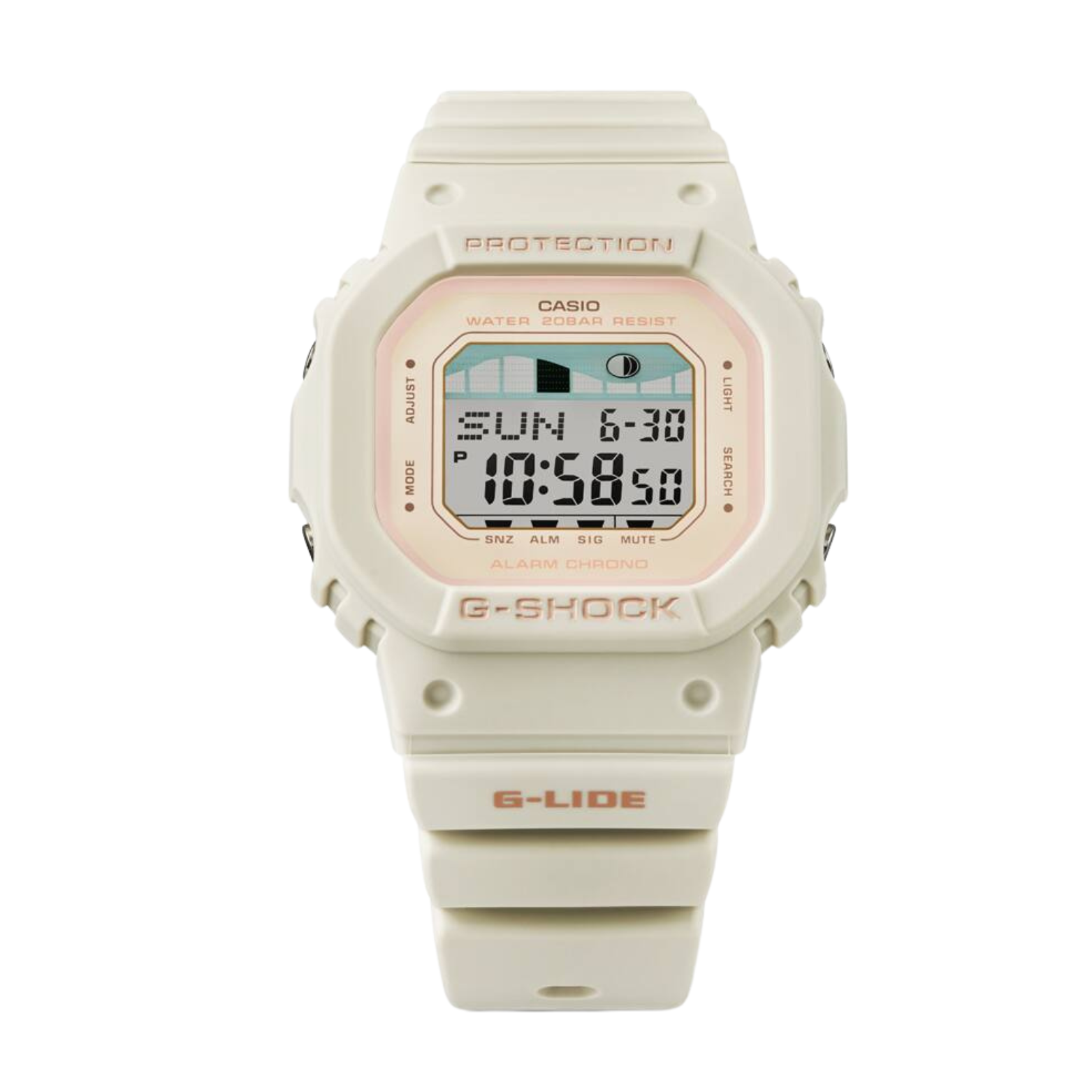 A CASIO G-SHOCK watch with a beige case and band, digital display showing time and various watch features, and a pink accent on the display.