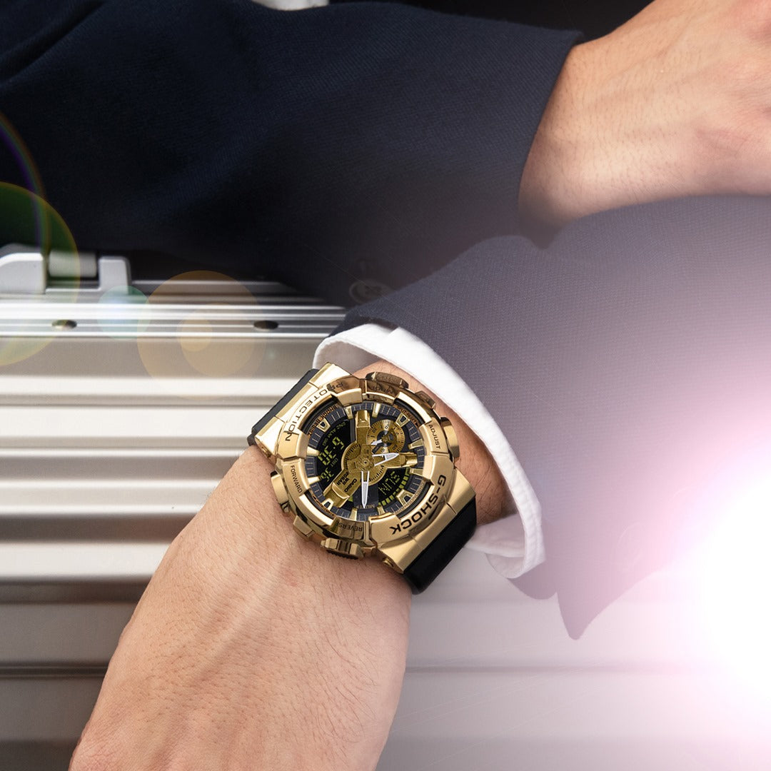 A Casio G-Shock watch with a gold ion-plated case and black resin band, displaying a digital and analog time.