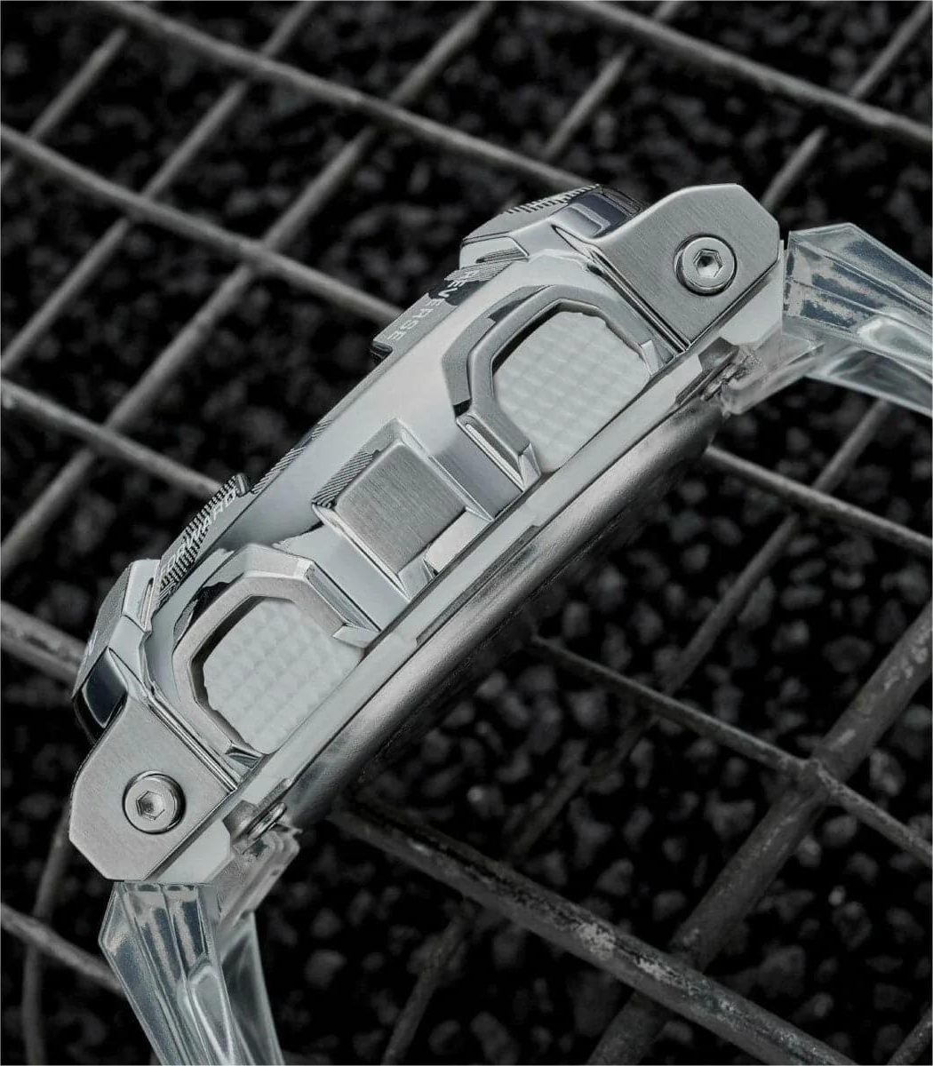 A Casio G-Shock analog-digital watch with a clear resin band and a white resin case featuring a digital display and multiple watch features.