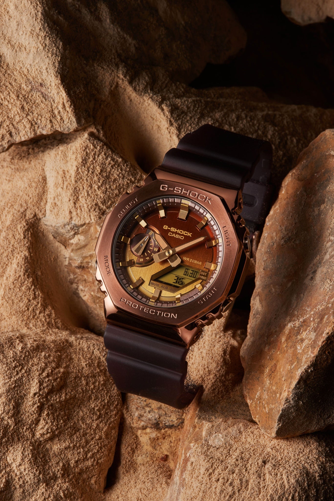 A Casio G-Shock watch with a brown resin band and case, featuring a digital display and analog hands.