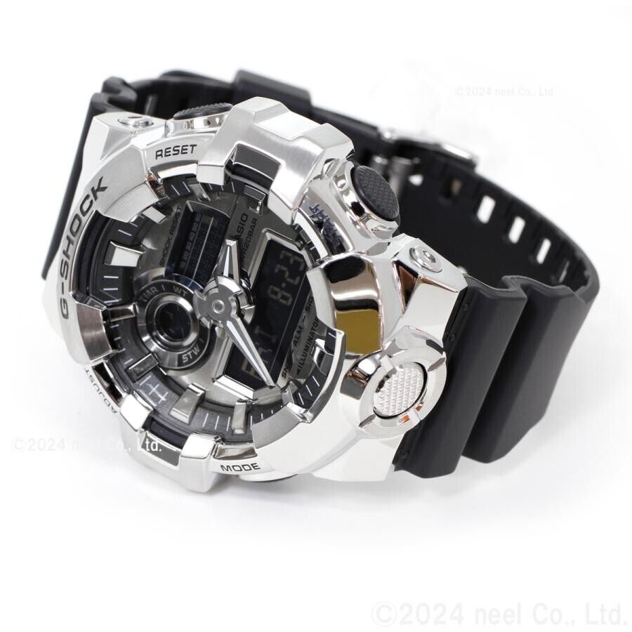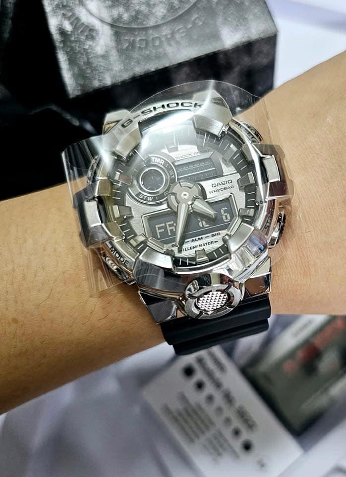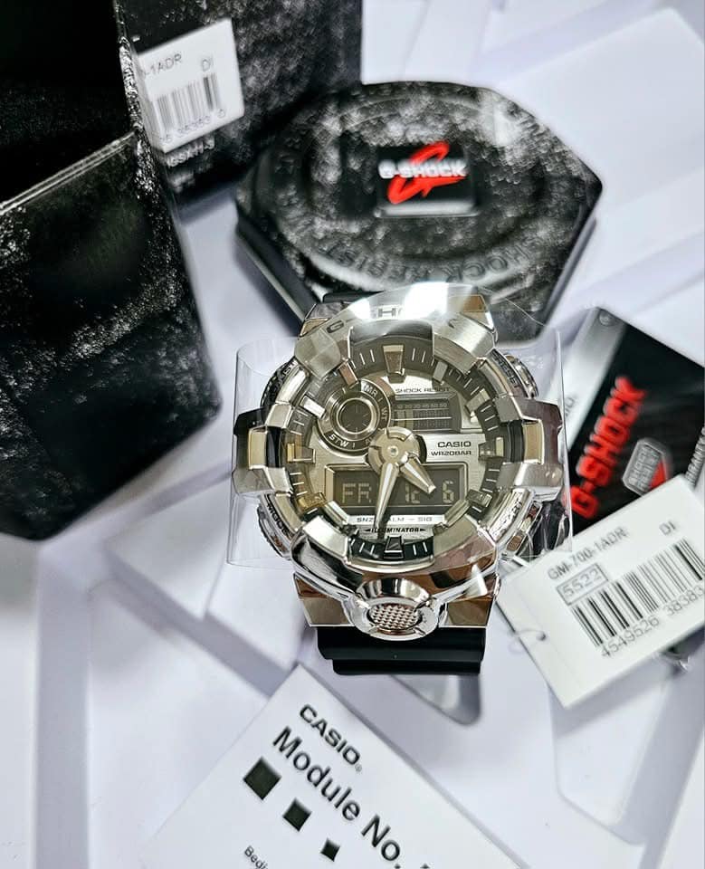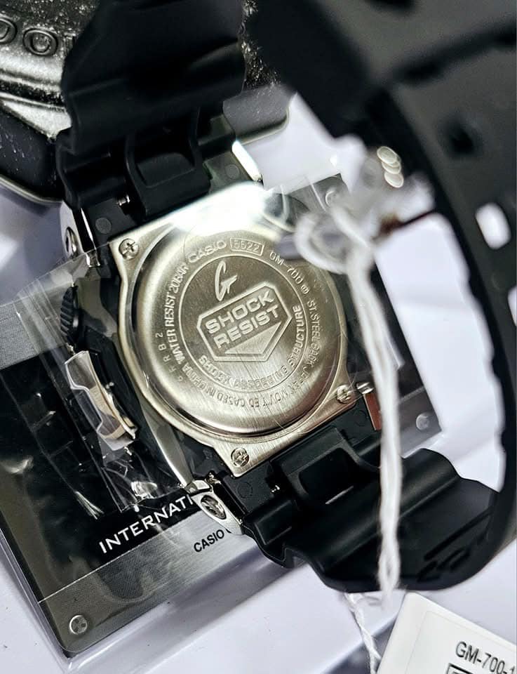 A Casio G-Shock GM-700-1A watch with a digital display, featuring a black band and silver-tone case.