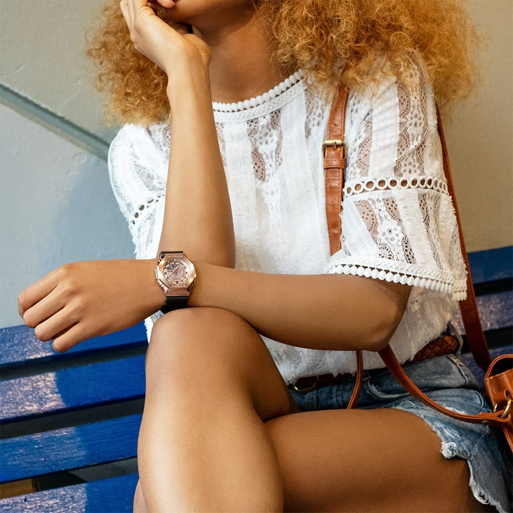 A Casio G-Shock watch with a rose gold case and black resin band, displaying an analog-digital dial.