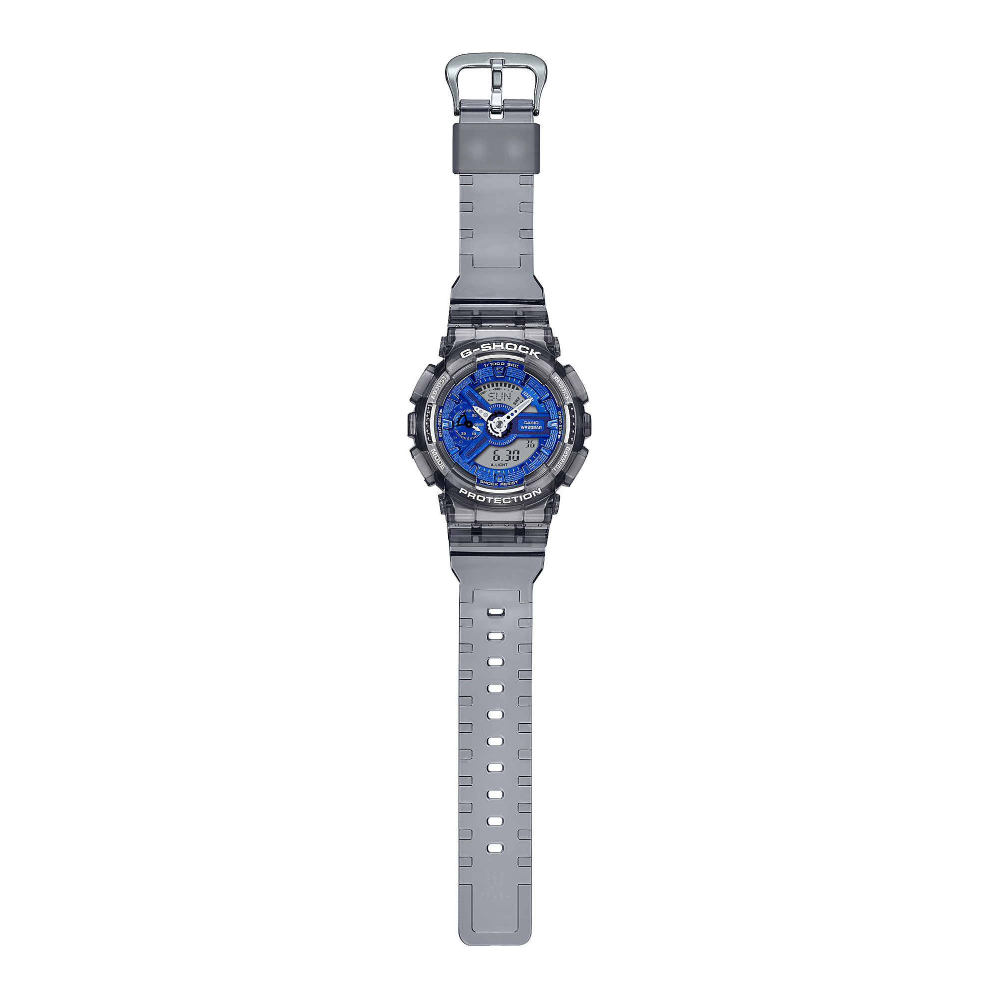 A Casio G-Shock watch with a blue analog dial and a gray resin strap, showcasing a digital and analog display, along with a LED light feature.