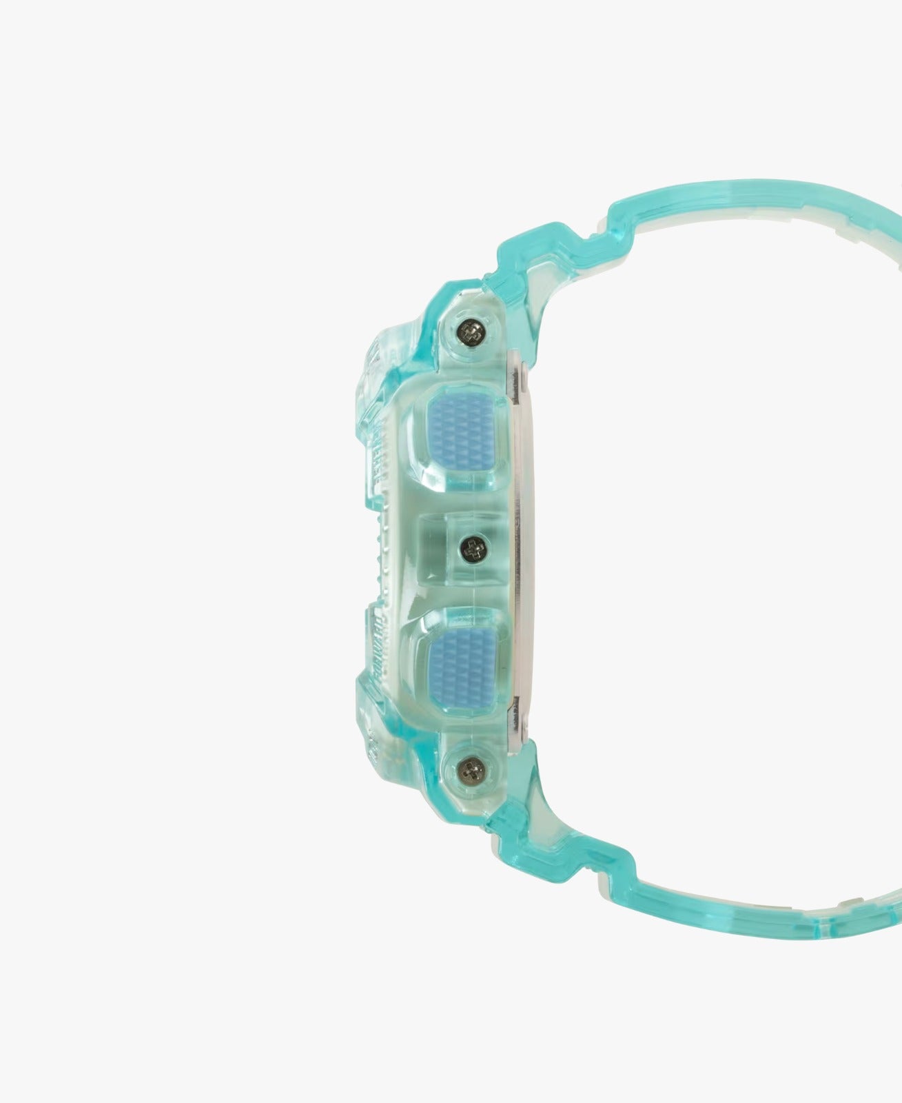 A Casio G-Shock analog-digital watch with a light blue resin band and case, digital display showing time and various watch features.