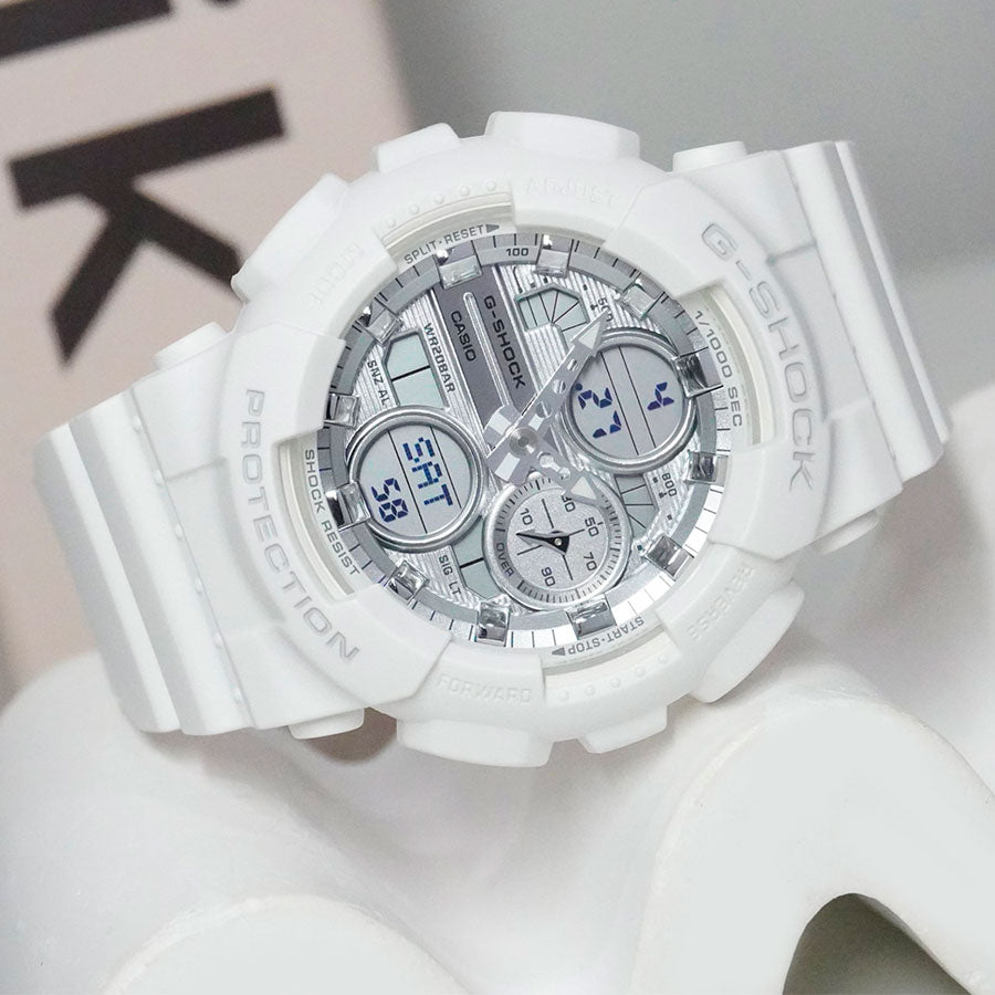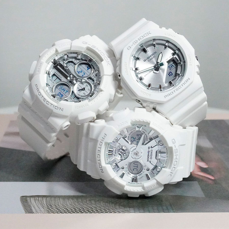 A white CASIO G-SHOCK watch with a resin band and digital display, showing features such as a stopwatch and world time functionality.