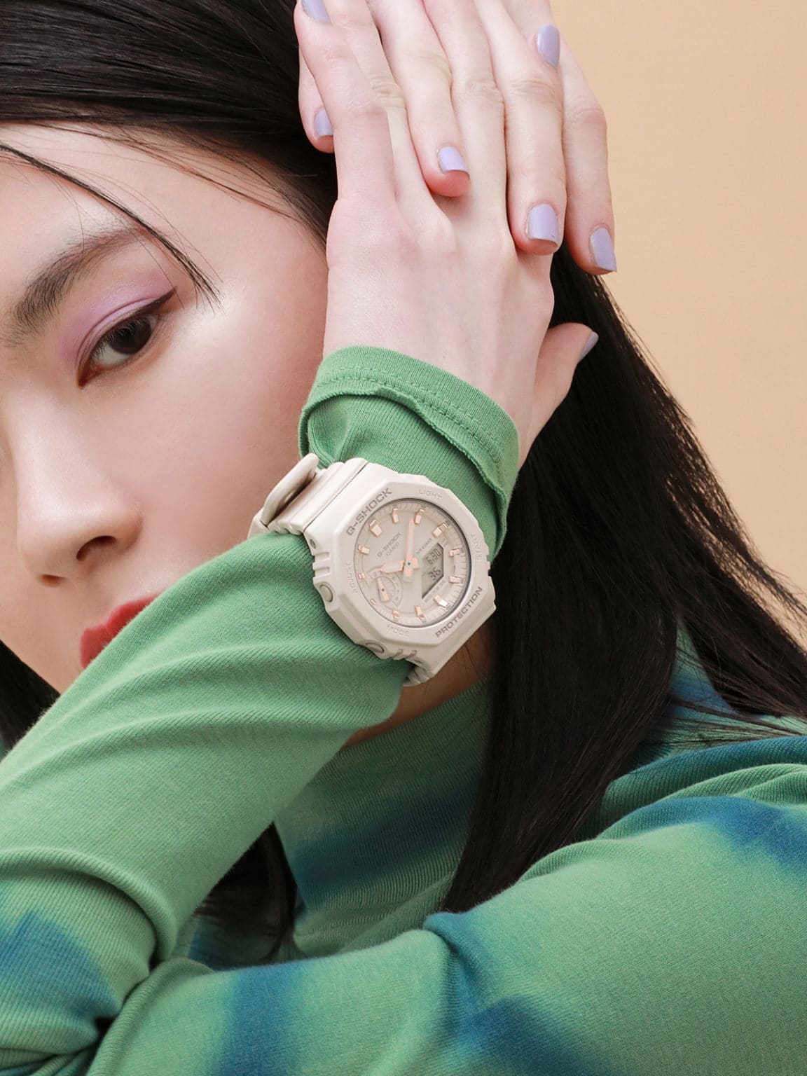 A Casio G-Shock watch with a beige band and casing, digital display, and analog features.