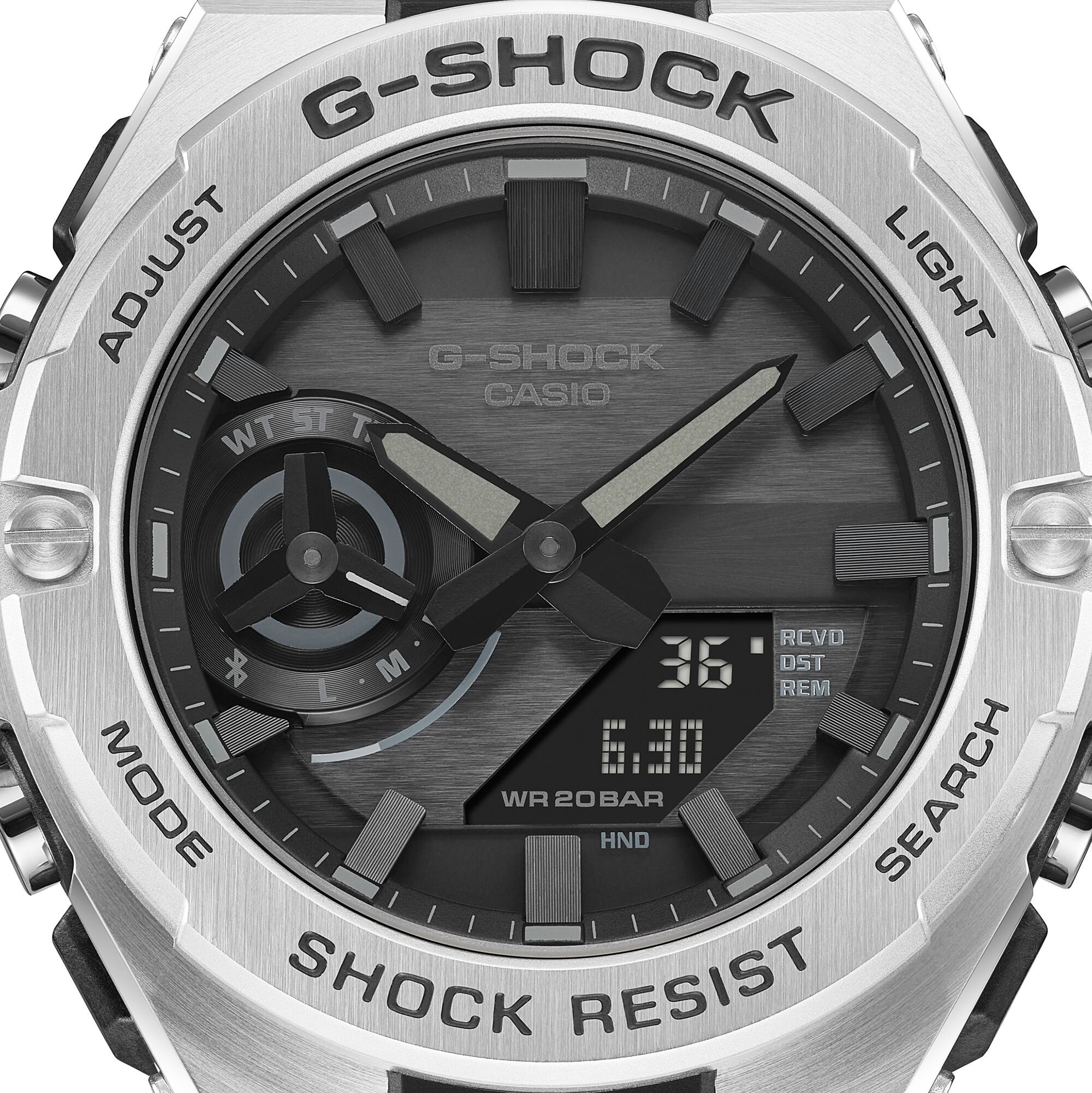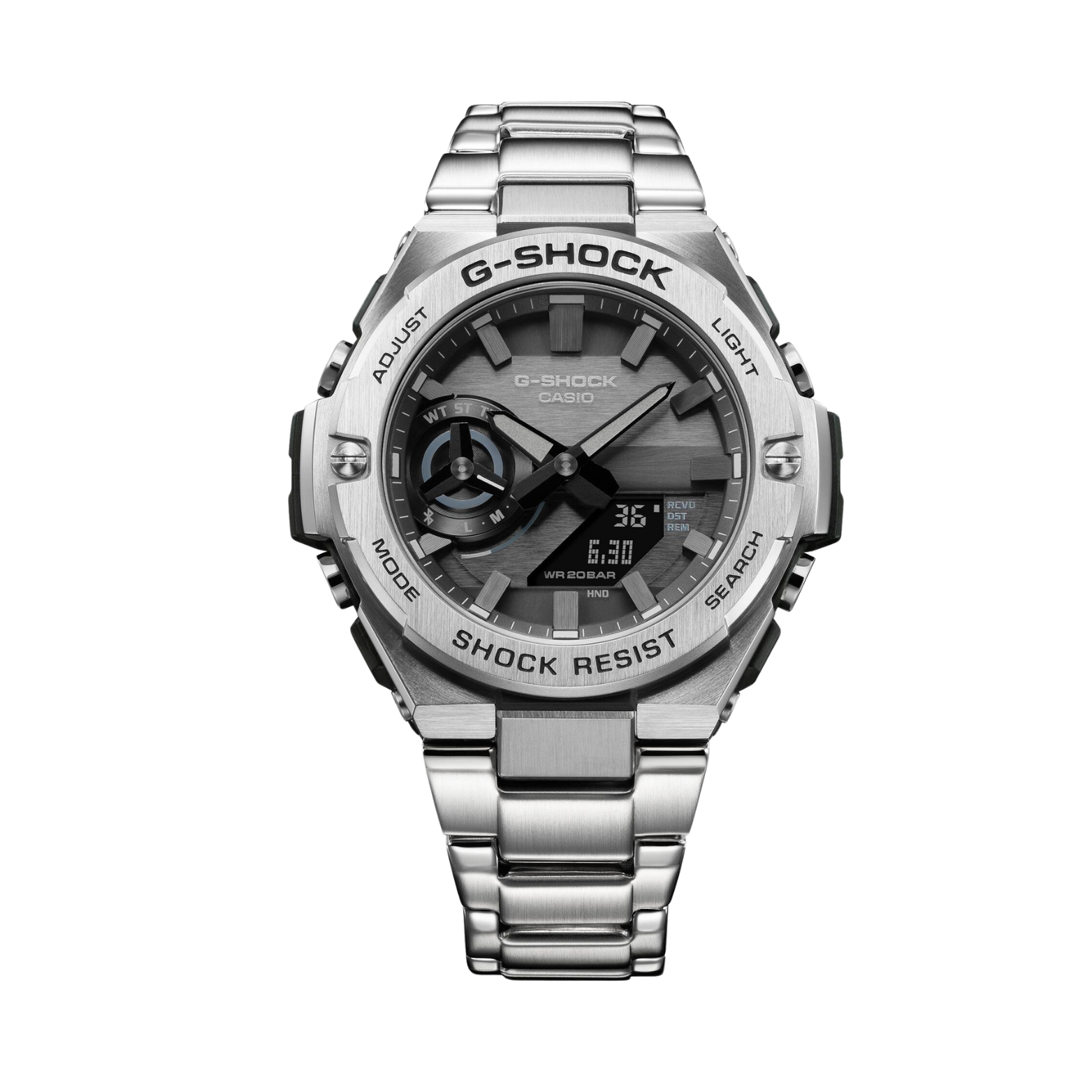 A CASIO G-SHOCK GST-B500D-1A1DR watch with a silver band and case, featuring a digital display and analog hands, shock resist and smartphone link capabilities.