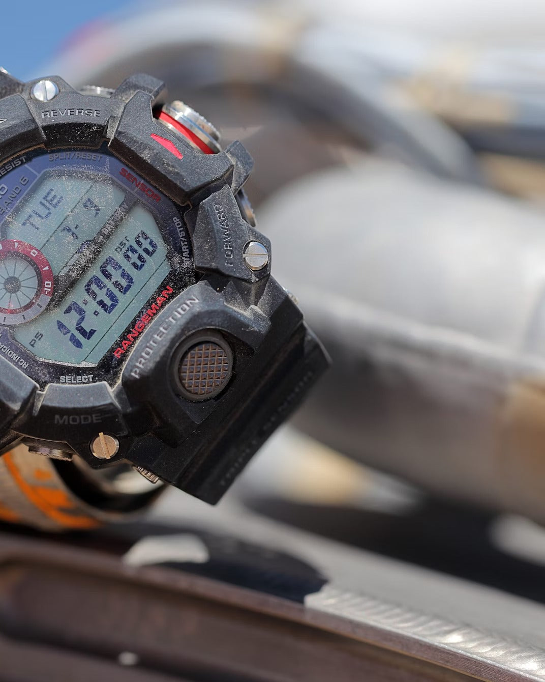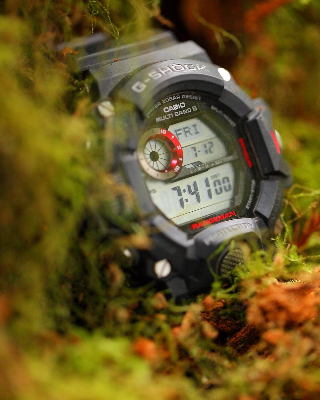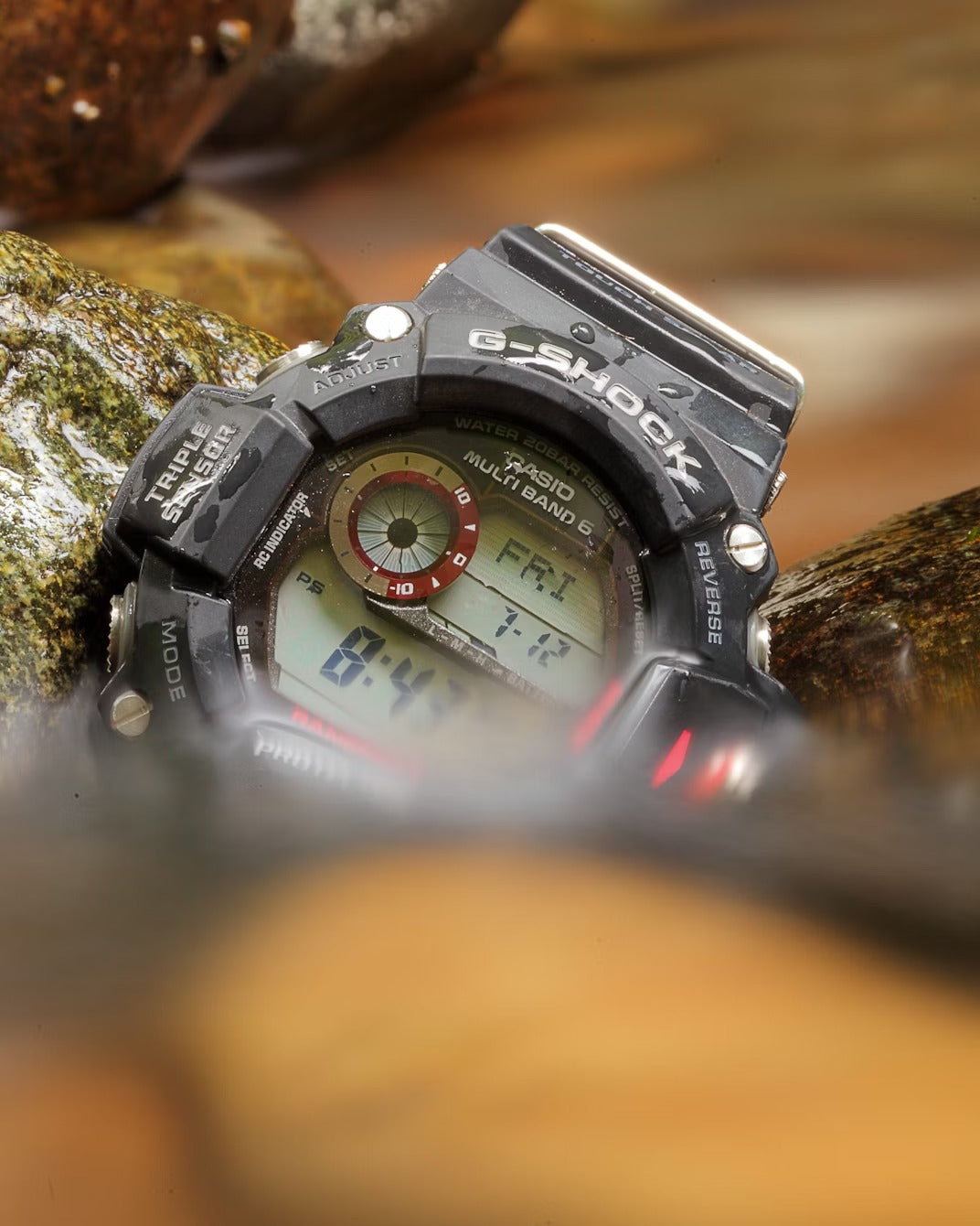 A black CASIO G-SHOCK GW-9400-1DR watch with a digital display, multi-band capability, and resin band construction.