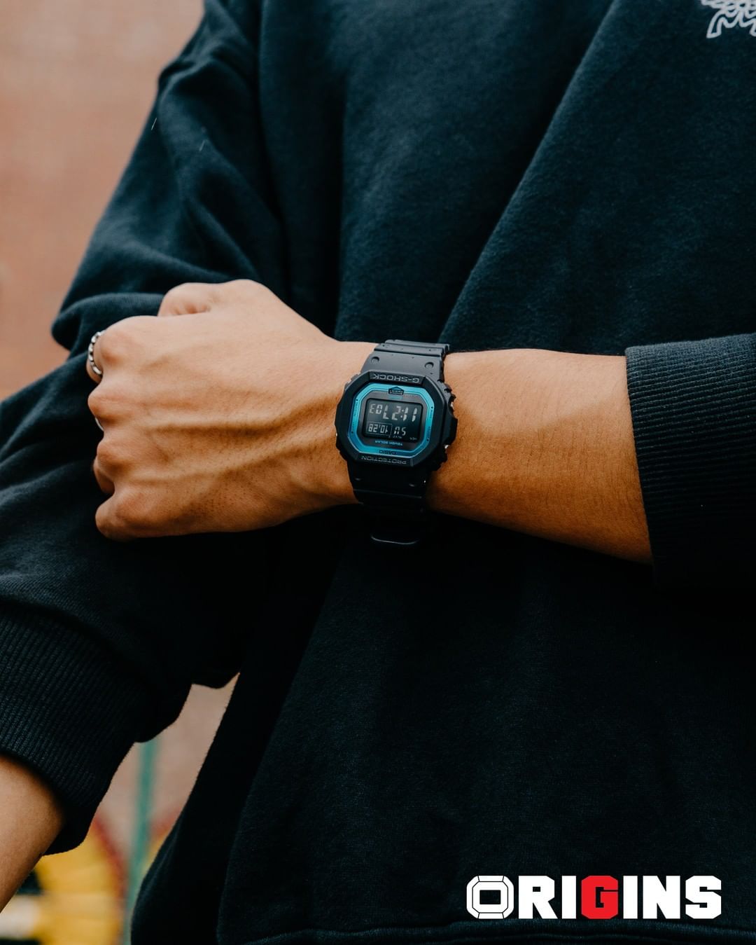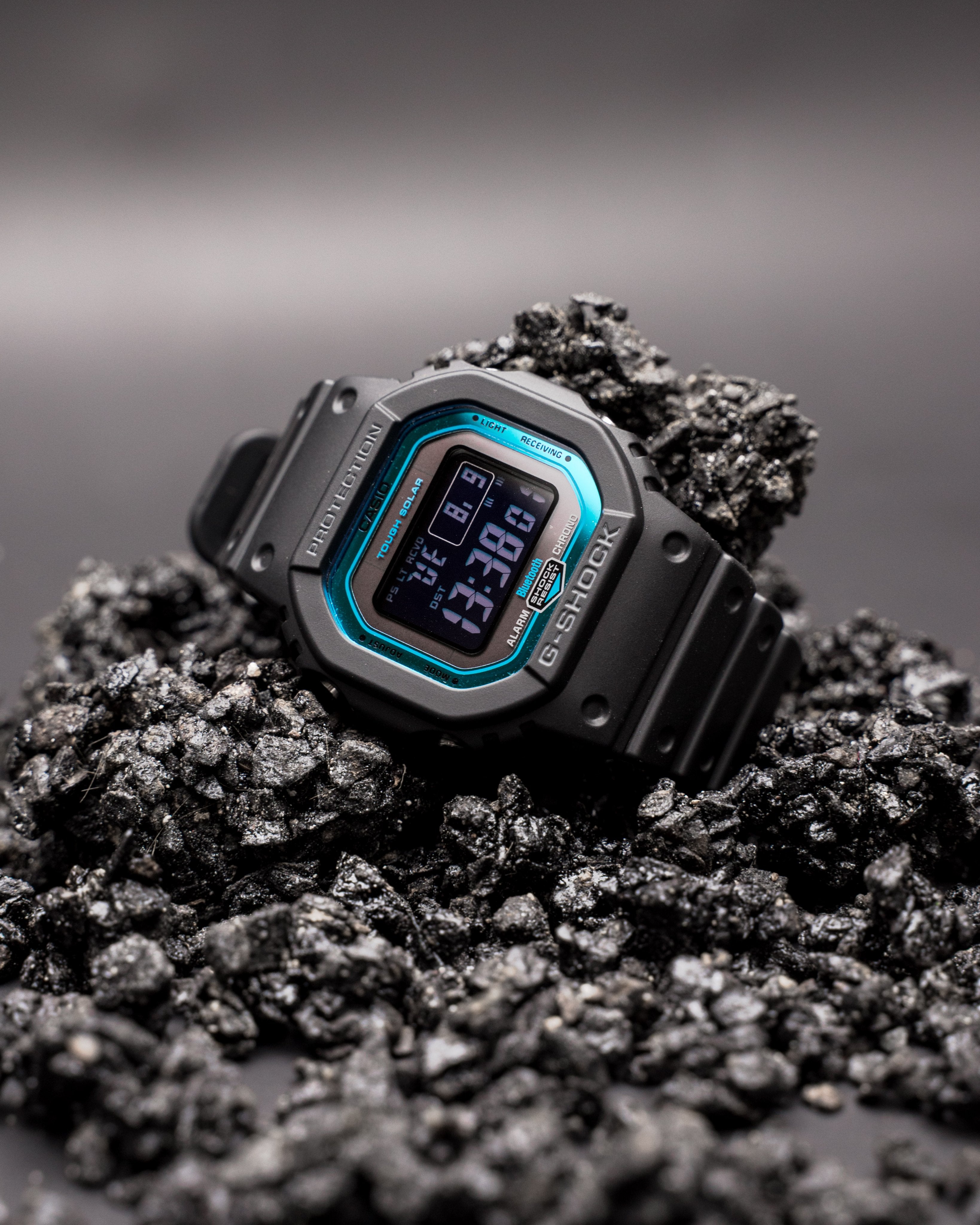 A black CASIO G-SHOCK watch with a blue bezel and digital display showing time and date.